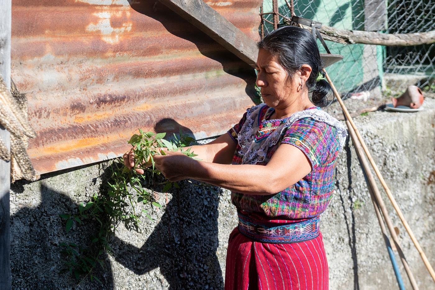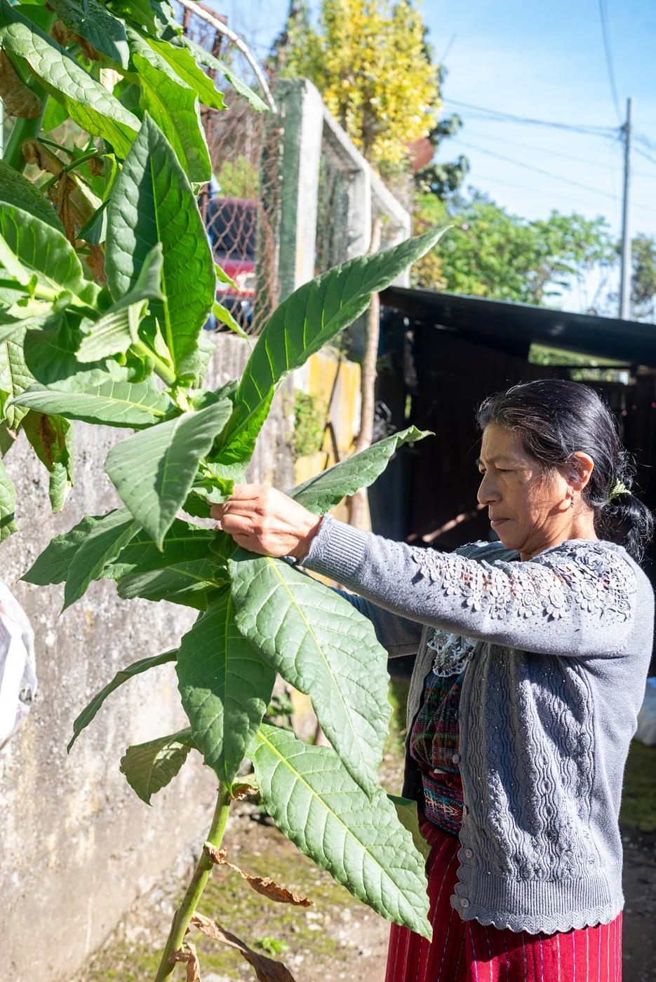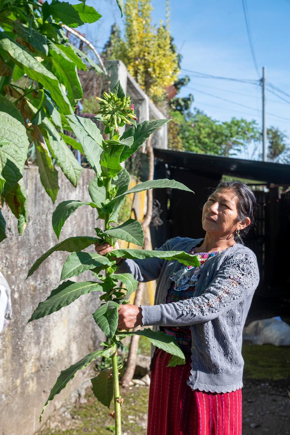 Doña Emilia con el K’utz, una de las plantas medicinales que utiliza para calmar dolores del cuerpo y dolor de muelas. Foto José Emilio Francisco