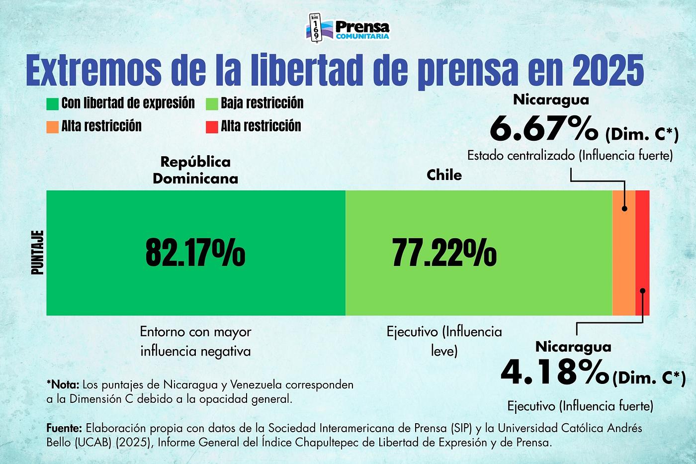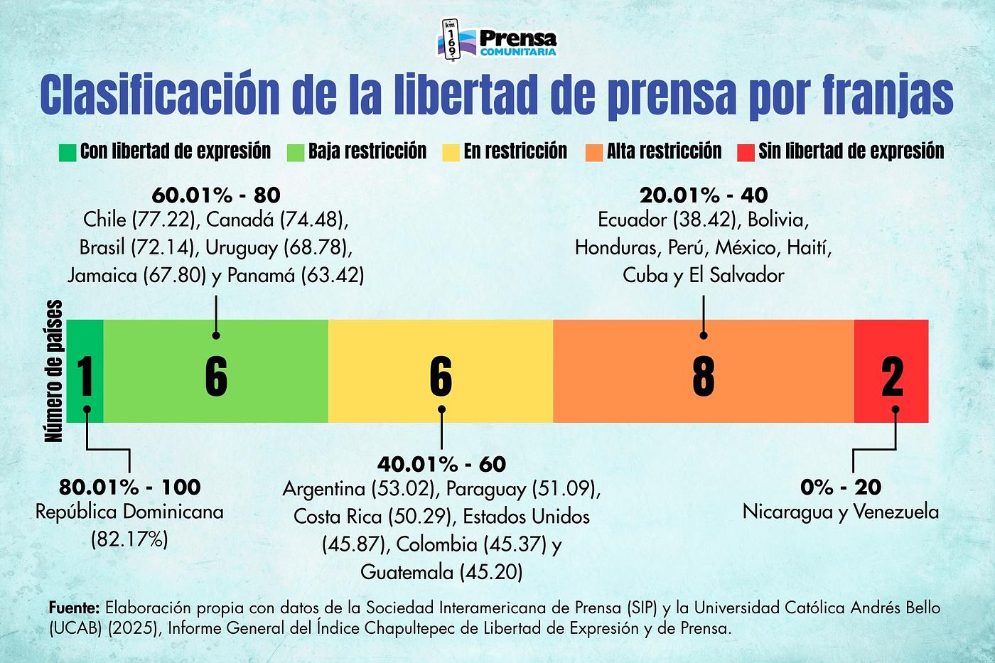 Fuente: Elaboración propia con datos de la Sociedad Interamericana de Prensa (SIP) y la Universidad Católica Andrés Bello (UCAB) (2025), Informe General del Índice Chapultepec de Libertad de Expresión y de Prensa.