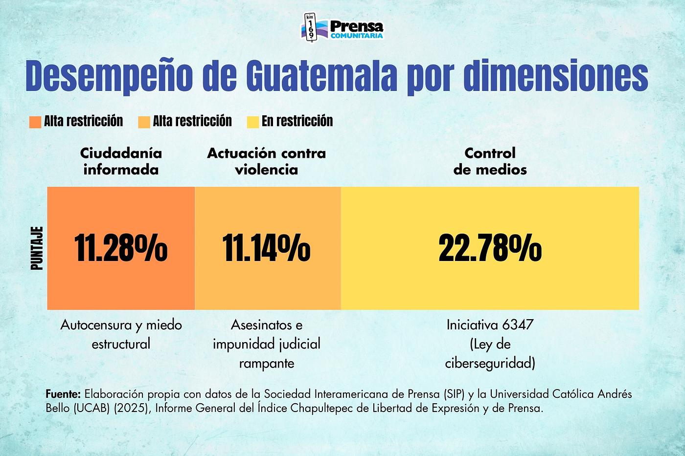 El desglose de las dimensiones revela que, mientras el Ejecutivo de Guatemala ha relajado el control directo, las bases de la ciudadanía informada y la seguridad del periodista están en ruinas: