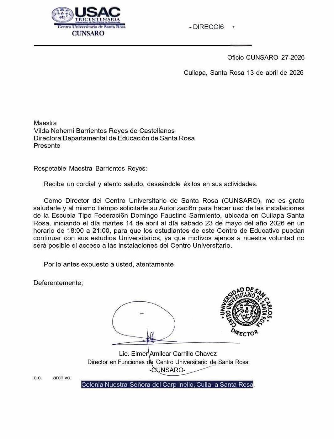 Dos días después de ese pronunciamiento, apareció otra señal de cómo la administración respondió al conflicto. El director interino, Elmer Amílcar Carrillo Chávez, firmó un oficio para solicitar el uso de la Escuela Tipo Federación Domingo Faustino Sarmiento como sede temporal de actividades académicas, argumentando la imposibilidad de acceso a las instalaciones del centro universitario.