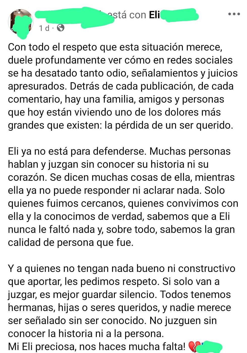 Mensaje publicado en el muro de redes sociales de Eleonora. Foto: Redes sociales