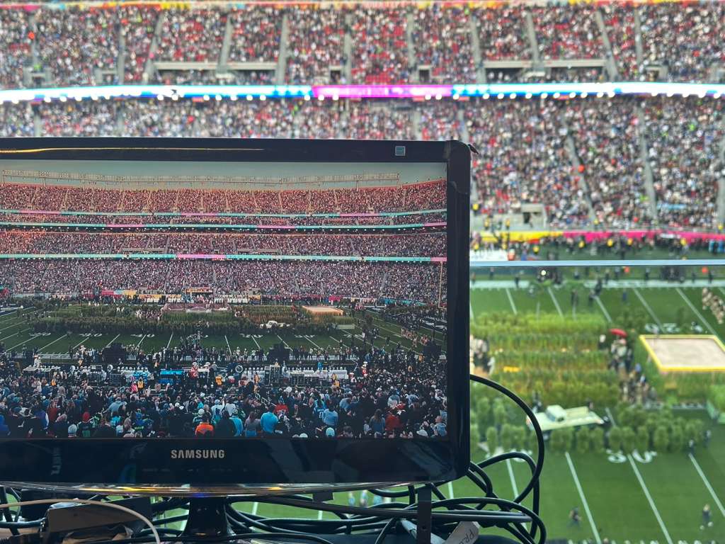 Vista desde la cabina de control del show de medio tiempo de Bad Bunny en el Supertazón. Crédito: Cortesía Gema Interiano