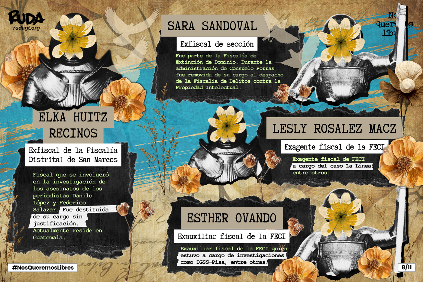 También están en esa lista, además de Laparra y Santizo, las exmagistradas Gloria Porras y Claudia Escobar (nombrada embajadora de Guatemala ante la OEA por el presidente Bernardo Arévalo), la jueza Erika Aifán, las fiscales Aliss Morán Mejía, Eva Siomara Sosa, Paola Michelle Escobar Quiñónez, Amy Girón, Samari Gómez Díaz, Wendy Patricia Ordóñez, Sarah Elizabeth Romero, Eleonora Castillo, Elena Sut e Hilda Pineda García, las mandatarias de CICIG Claudia González y Flor Gálvez Álvarez, y la abogada defensora de derechos humanos Wendy Geraldine López, entre otras.