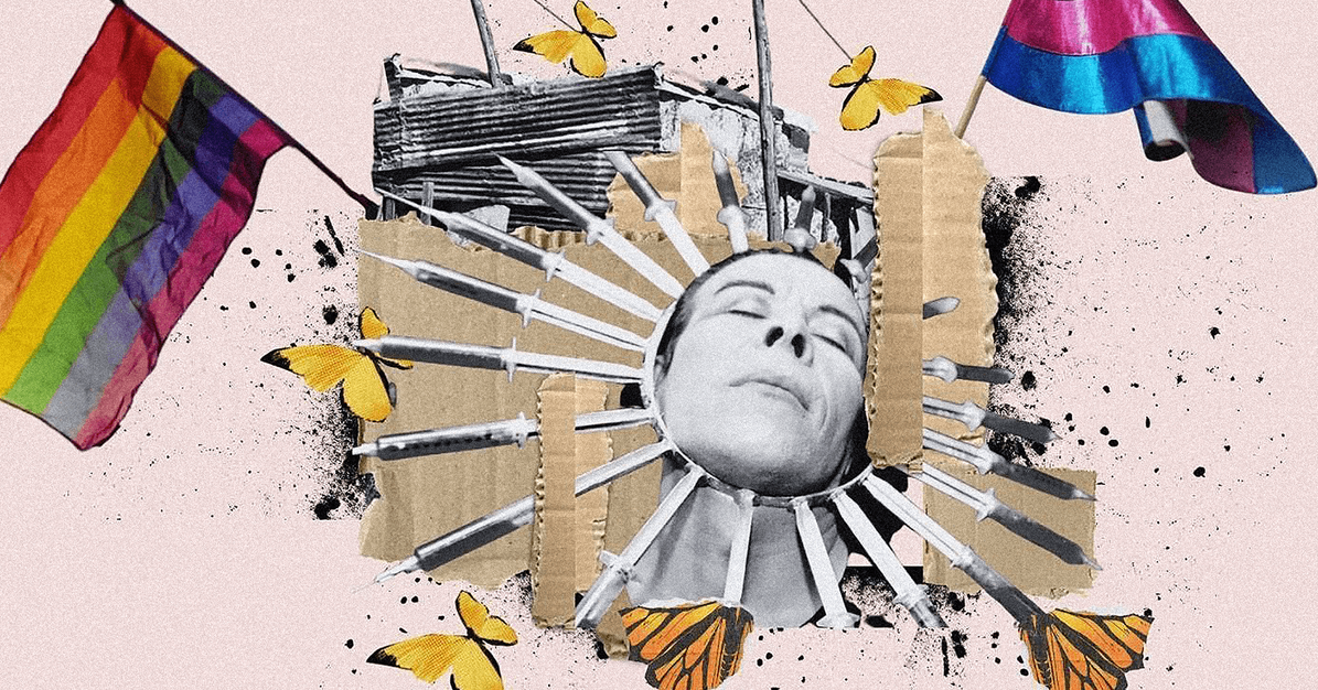 “Tan distante de esta realidad ilegal de crímenes impunes, del goteo de maricas charqueados por la tinta roja de algún diario, expuestos en su palidez de castigo como reiteración de las puñaladas en el borde plateado de costilla apátrida. Cadáveres sobre cadáveres tejen nuestra historia en punto cruz lacre”Pedro Lemebel – Loco afán