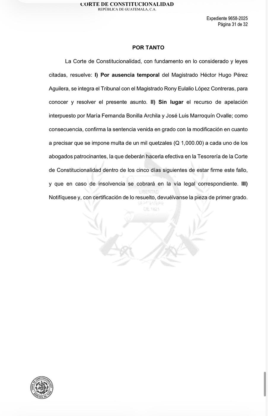 El Tribunal de Mayor Riesgo “C” fijó para el 14 de diciembre de 2027 el inicio del juicio contra Bonilla Archila y Marroquín Ovalle. El debate oral y público se realizará a las 9:00 horas en la sala de audiencias del nivel 13 de la Torre de Tribunales, en la capital.