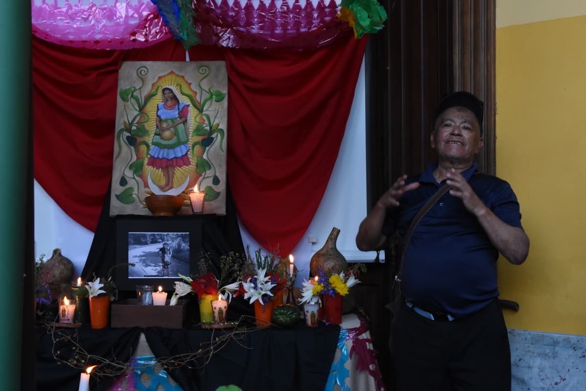 Tata Chonito, encargado de la comisión de espiritualidad y educación del Parlamento Xinka, frente a un altar de La Montaña. Foto de Lucero Sapalú