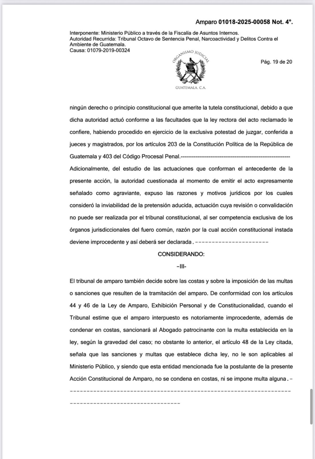 Los magistrados también resolvieron a favor de la petición del Ministerio Público (MP) y de los querellantes adhesivos, la Fundación Contra el Terrorismo (FTC) y el exjuez Lesther Castellanos, que solicitaron girar una orden de captura internacional contra Laparra y dejar sin efecto las medidas sustitutivas que tenía vigentes.