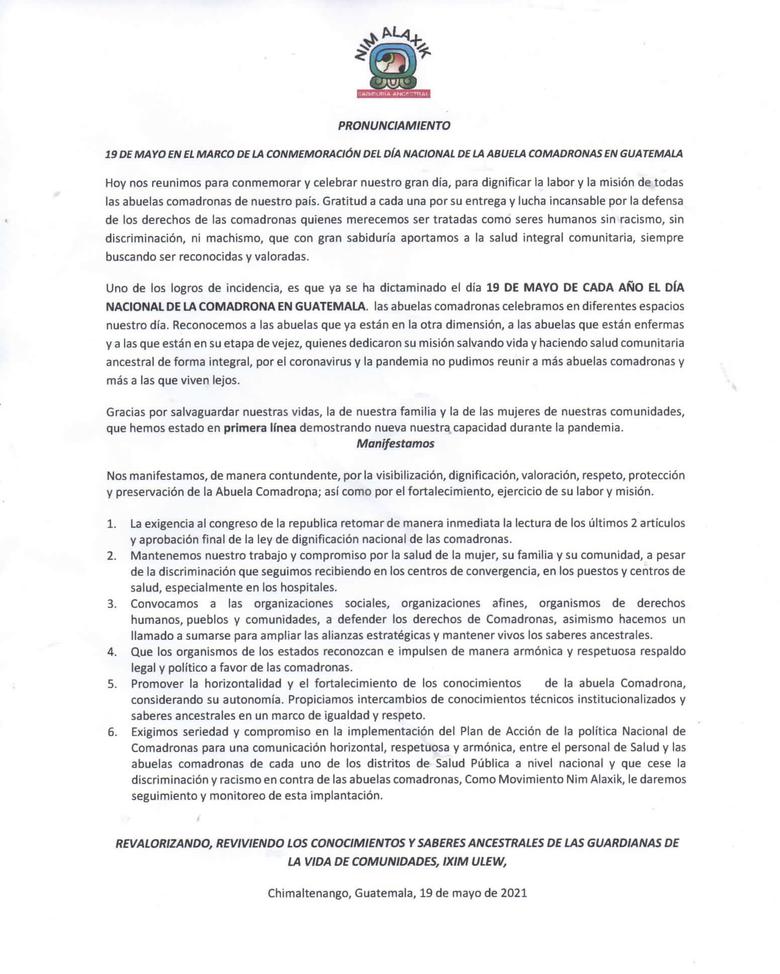 6. Exigimos seriedad y compromiso en la implementación del Plan de Acción de la política Nacional de Comadronas para una comunicación horizontal, respetuosa y armónica, entre el personal de Salud y las abuelas comadronas de cada uno de los distritos de Salud Pública a nivel nacional y que cese la discriminación y racismo en contra de las abuelas comadronas, Como Movimiento Nim Alaxik, le daremos seguimiento y monitoreo de esta implantación.