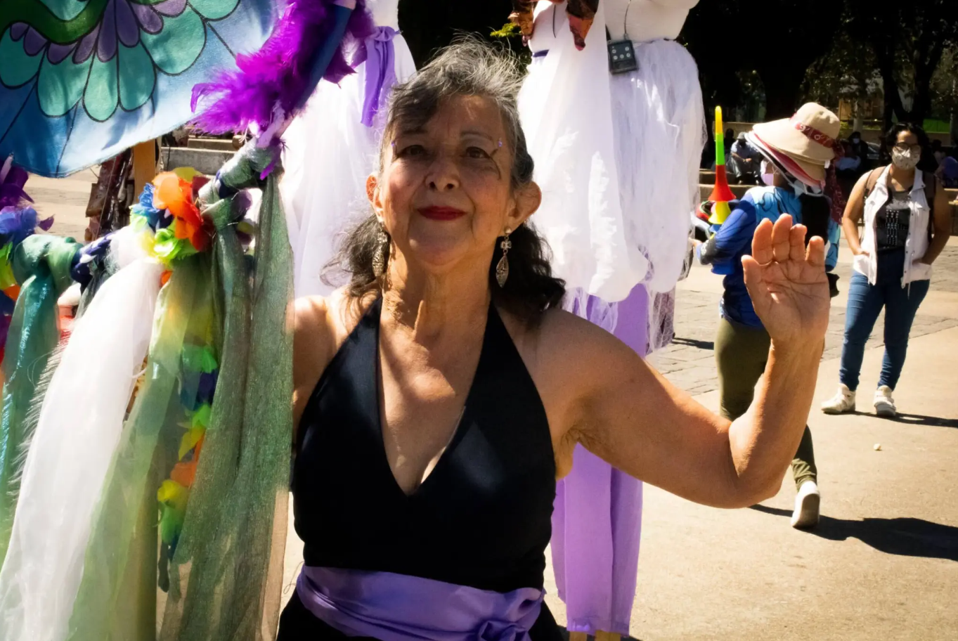 La caravana llevaba distintos bloques, de mujeres diversas, artistas, mayas, jóvenes estudiantes y organizaciones que llevan varios años en la lucha por los derechos de las mujeres. Uno de los bloques era un grupo de mujeres que, con el baile, sombrillas, redoblantes y distintos instrumentos, a través de su arte mostraban su resistencia y rechazo a la violencia patriarcal.