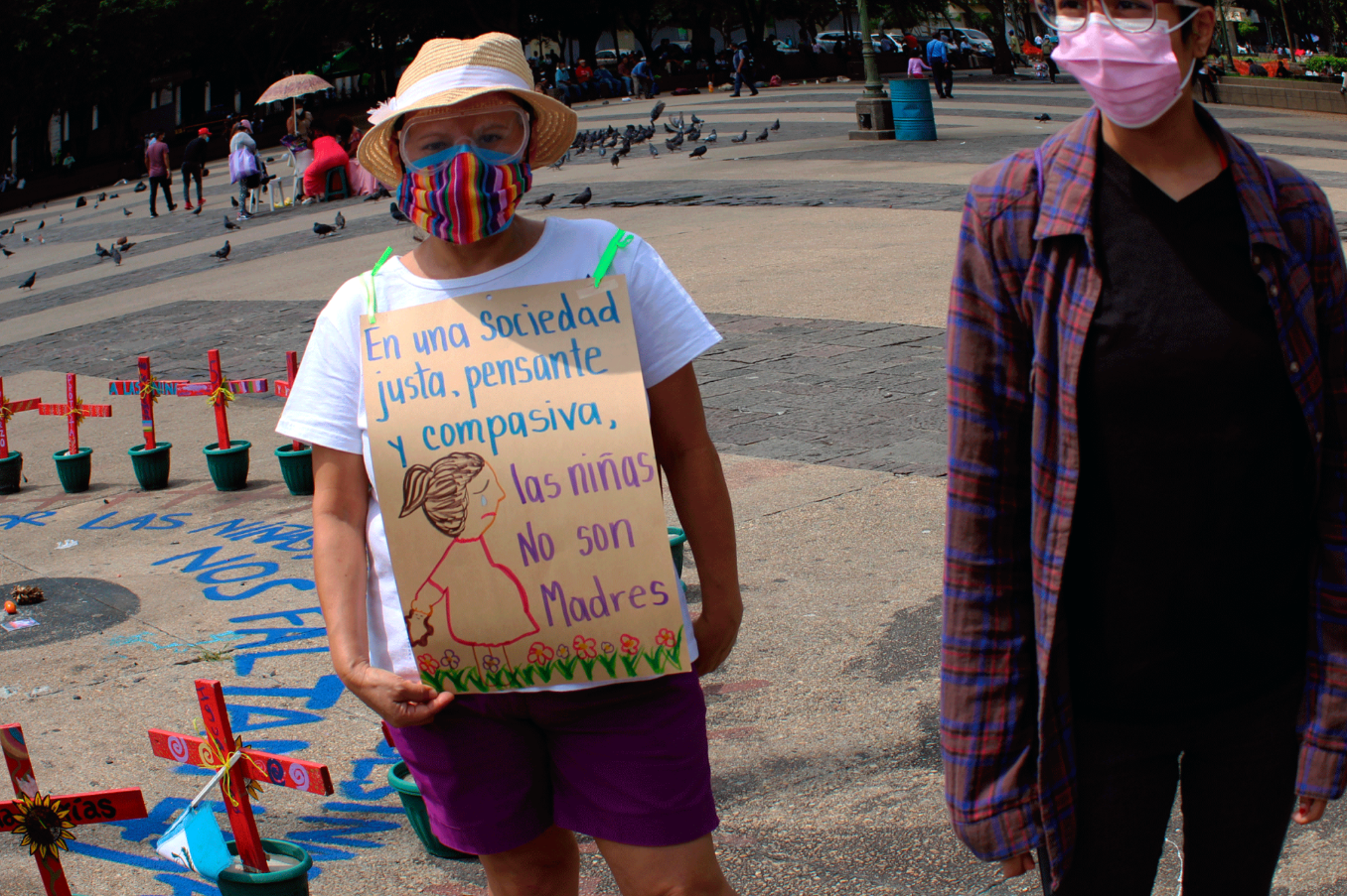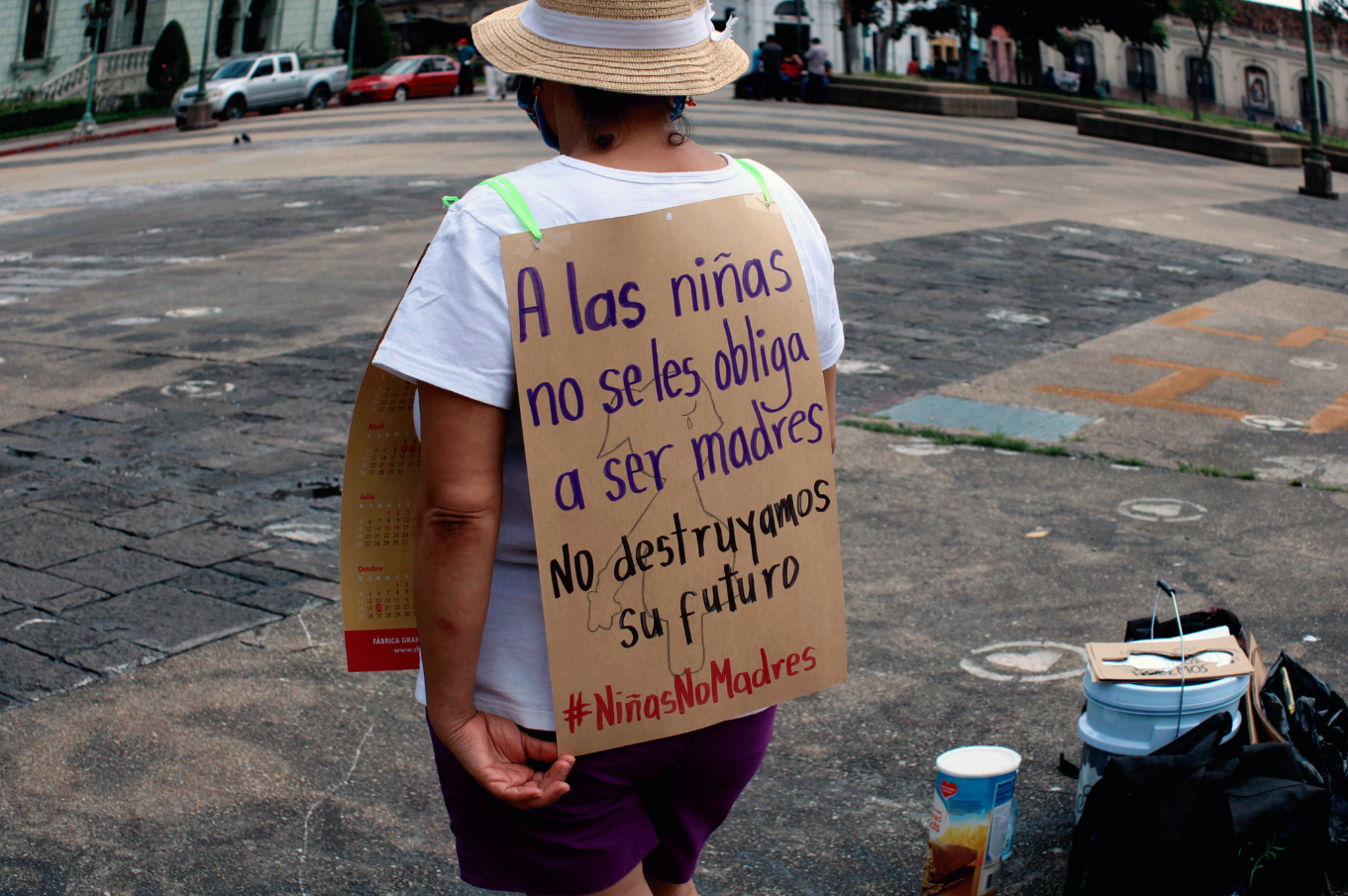 En Guatemala según la Coordinadora Institucional de Promoción por los Derechos de la Niñez -CIPRODENI-, de enero a julio de 2020, 2,2289 niñas de 10 a 14 años quedaron embarazadas por violación, pues según el Código Penal en Guatemala, se considera una violación cuando una niña es menor a 14 años. Ante estos datos, a las 10 de la mañana empezaron a hacerse presentes algunas mujeres en la Plaza de las Niñas, una de ellas portaba en los hombros un cartel con un mensaje muy claro y fuerte: