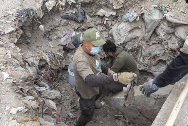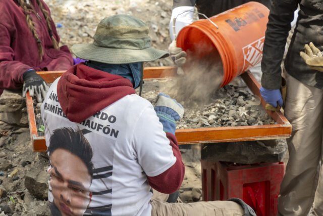 Las jornadas consisten en continuar cavando agujeros de 1.5 metros de diámetro hasta encontrar suelo sólido, tarea que realizan principalmente bomberos y personal de las fiscalías. Lo que extraen es llevado a una hilera de coladeras donde las familias y peritos buscan cualquier resto óseo.