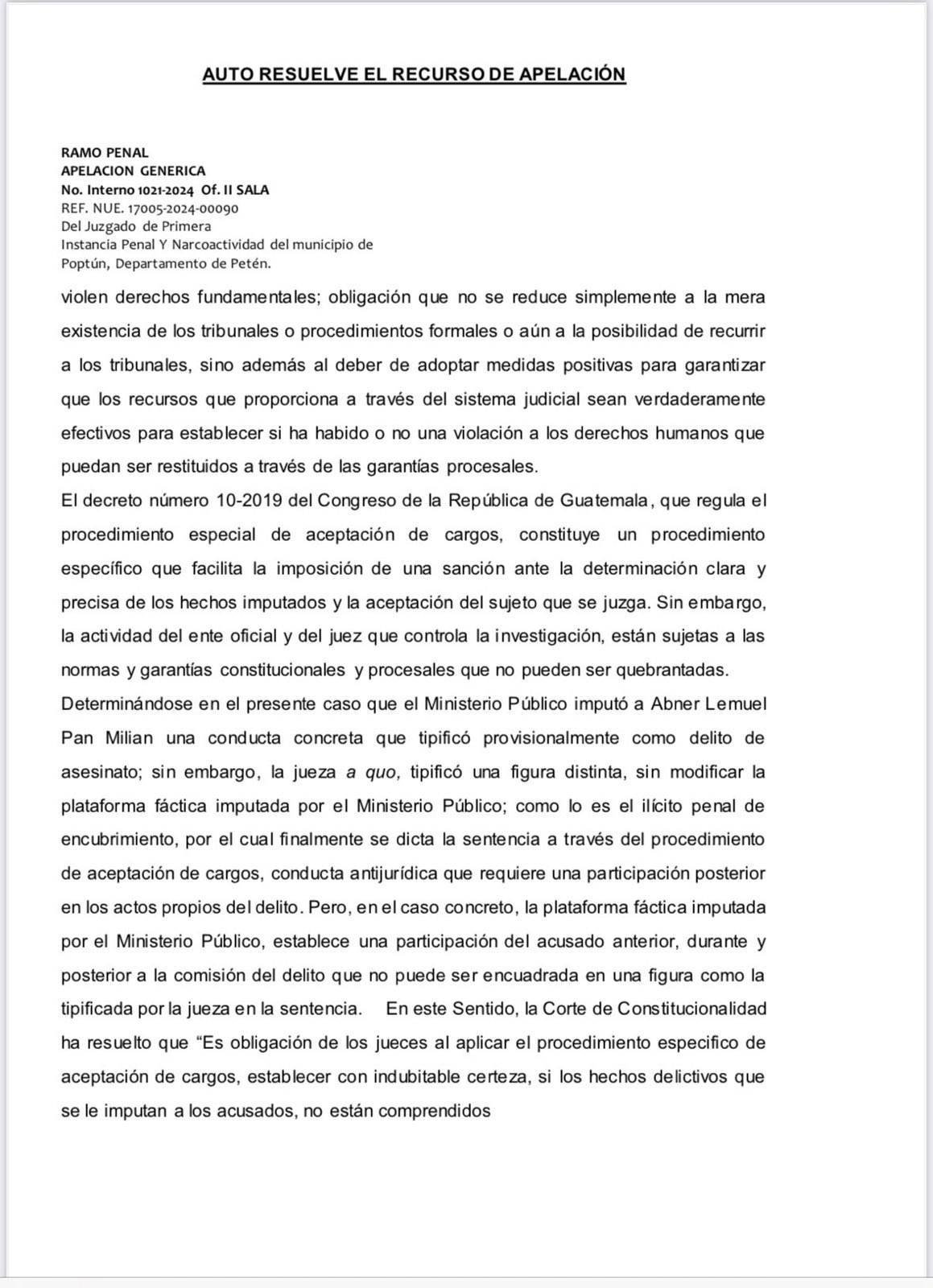 “En este Sentido, la Corte de Constitucionalidad ha resuelto que “es obligación de los jueces al aplicar el procedimiento específico de aceptación de cargos, establecer con indubitable certeza, si los hechos delictivos que se le imputan a los acusados, no están comprendidos dentro de los que la ley rectora del acto establece que no es factible que se le otorguen los beneficios respectivos debido a que el legislador consideró que algunos delitos, deberían quedar excluidos de la posibilidad de acudir a ese procedimiento (Sentencia de fecha veinticinco de julio de dos mil veintitrés, dictada dentro del expediente número siete mil ciento noventa y tres guión do mil veintidós). En ese sentido, es criterio de esta Sala, que se han vulnerado garantías procesales que habilitan el recurso interpuesto y que además permite revocar la resolución emitida y así debe resolverse”, concluyó la Sala.