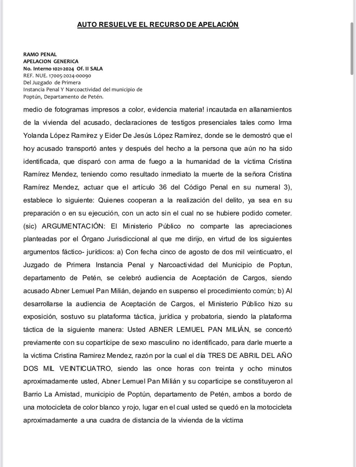 Recientemente, la Sala Regional Mixta de la Corte de Apelaciones del departamento de Petén aceptó una apelación presentada por fiscales de la Fiscalía de Femicidio asignados al caso del crimen de Cristina Ramírez Méndez, una mujer originaria del departamento de Petén y que fue víctima de femicidio el 3 de abril del 2024.
