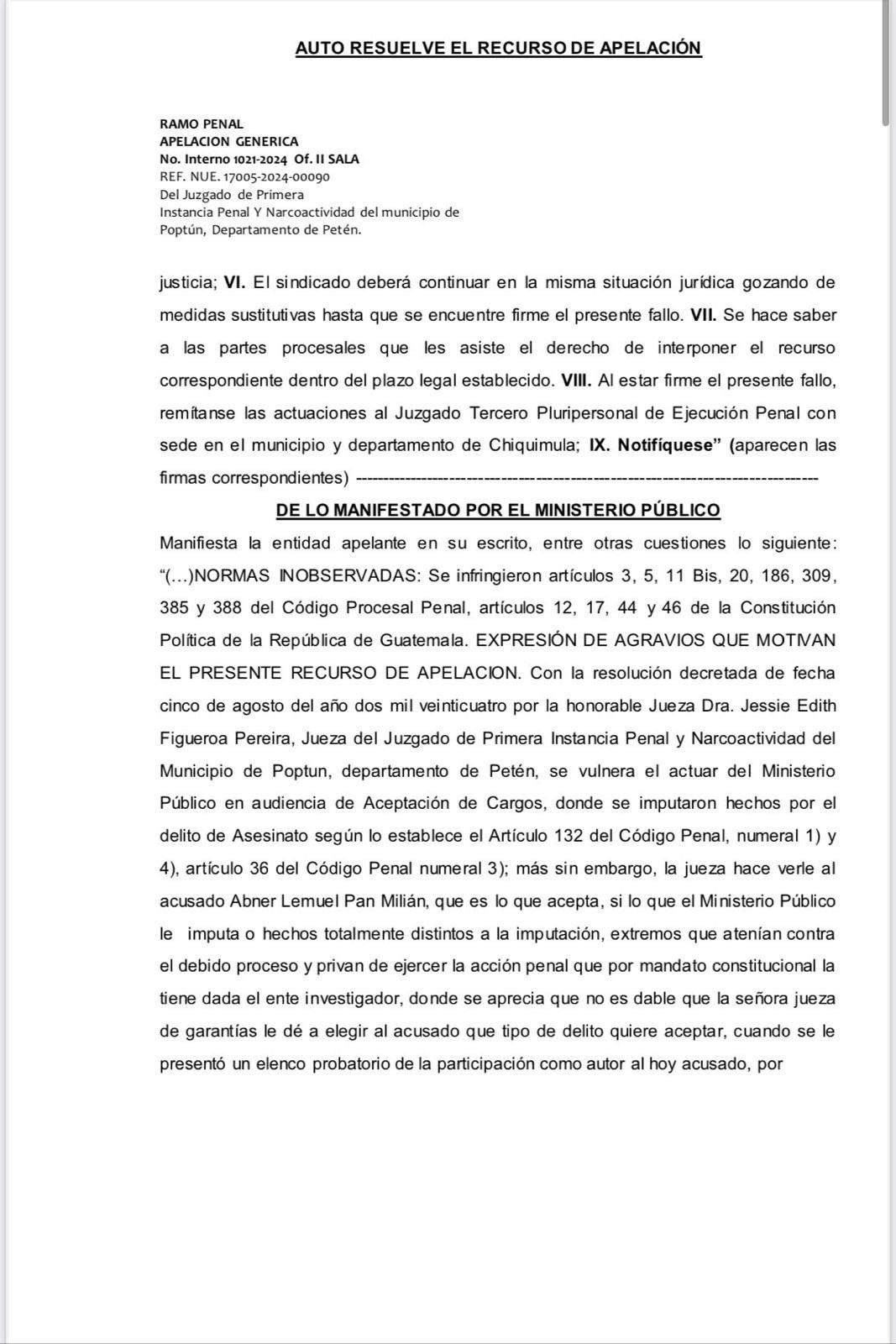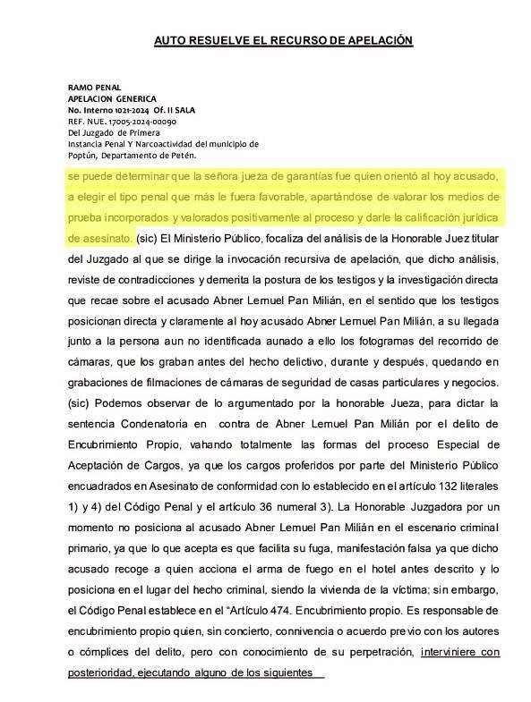 La Sala integrada por los magistrados Efraín Berganza Sandoval, magistrado Marco Antonio Ramos Sologaistoa y Karol Desireé Vásquez, dieron la razón a la fiscalía, y revocó la decisión del juzgado que había beneficiado al acusado de asesinato.