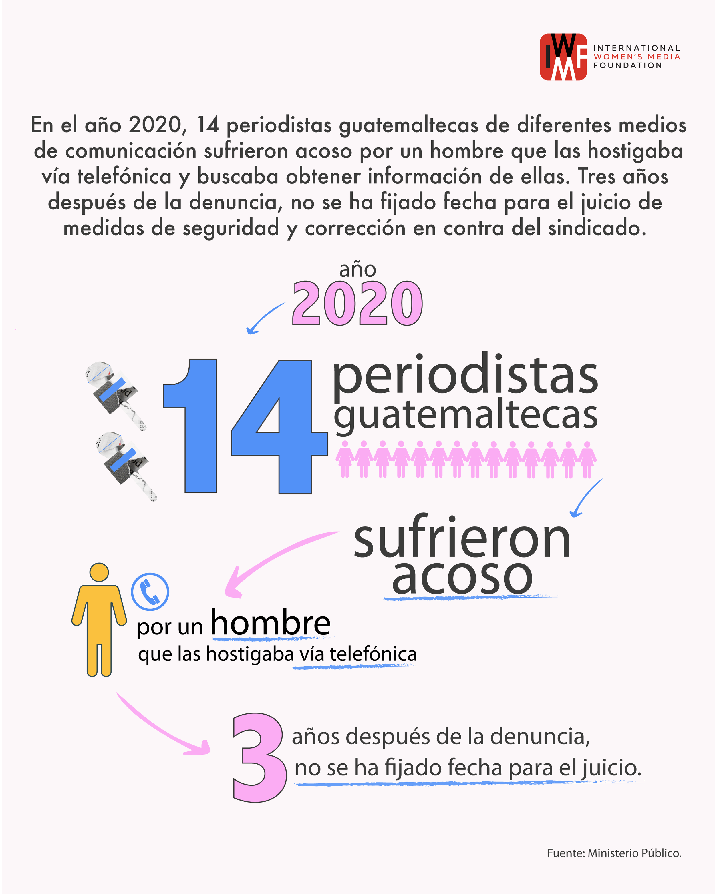 Uno de esos casos, ocurrió en 2020, cuando14 periodistas fueron acosadas por un hombre que vía telefónica fingía voz de mujer y pretendía obtener información de ellas. Las reporteras denunciaron ante la Fiscalía, pero tres años después aún no se ha fijado fecha para el juicio de medidas de seguridad y corrección contra el acosador.