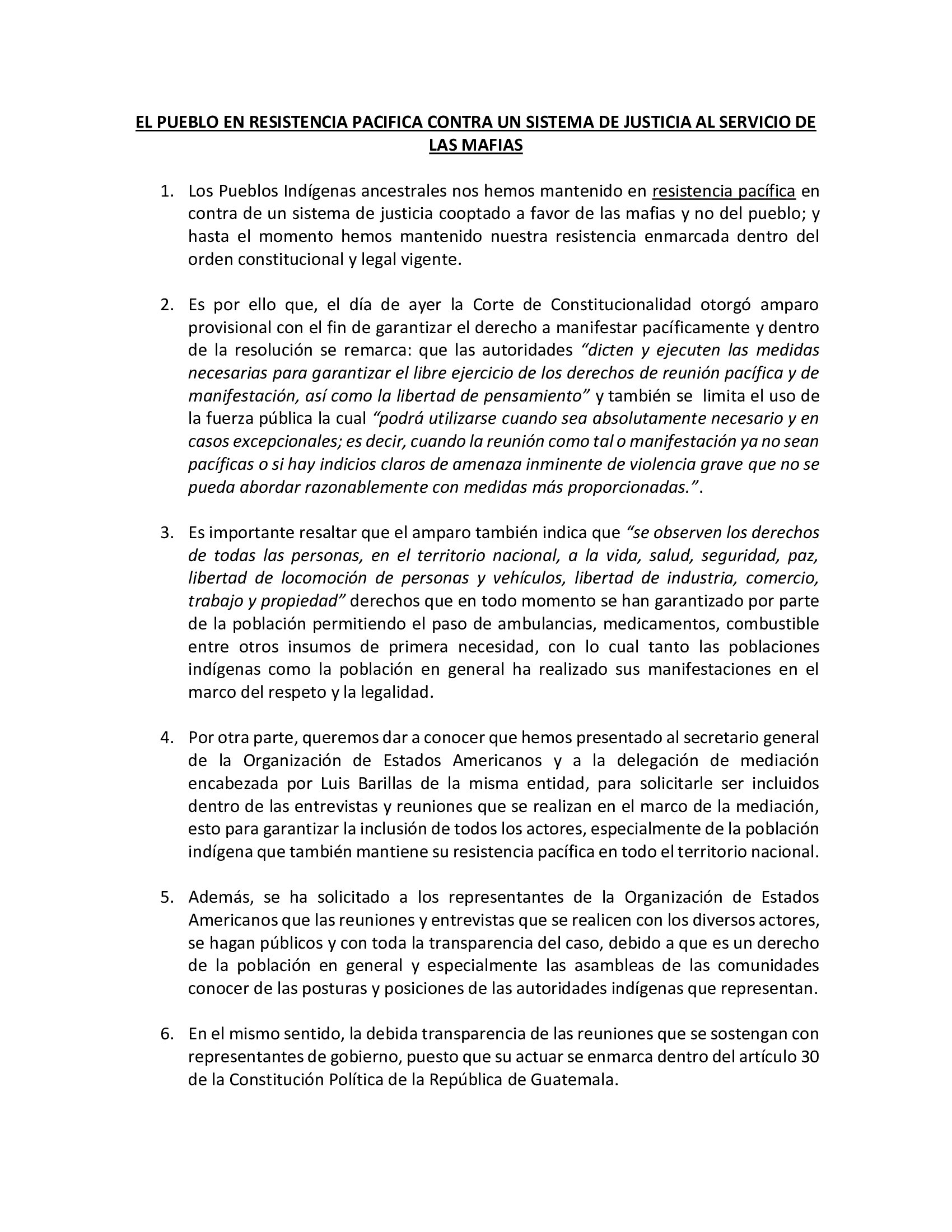 “Se ha solicitado a los representantes de la Organización de Estados Americanos que las reuniones y entrevistas que se realicen con los diversos actores, se hagan públicos y con toda la transparencia del caso, debido a que es un derecho de la población en general y especialmente las asambleas de las comunidades conocer de las posturas y posiciones de las autoridades indígenas que representan”.