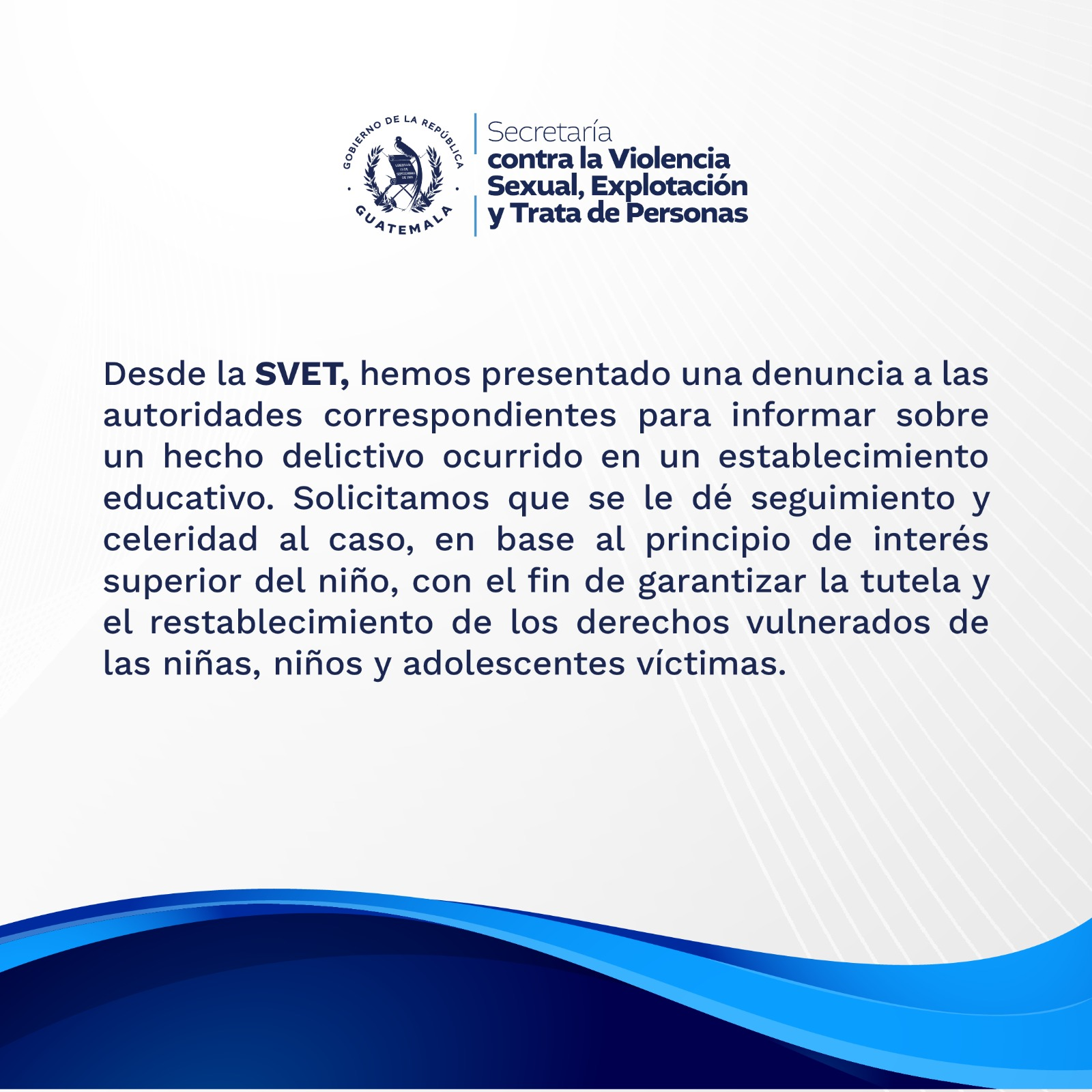 “Solicitamos el seguimiento y celeridad al caso, en base al principio de interés superior del niño, con el fin de garantizar la tutela y el restablecimiento de los derechos vulnerados de las víctimas”, se lee en el comunicado de la SVET.