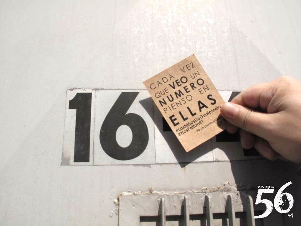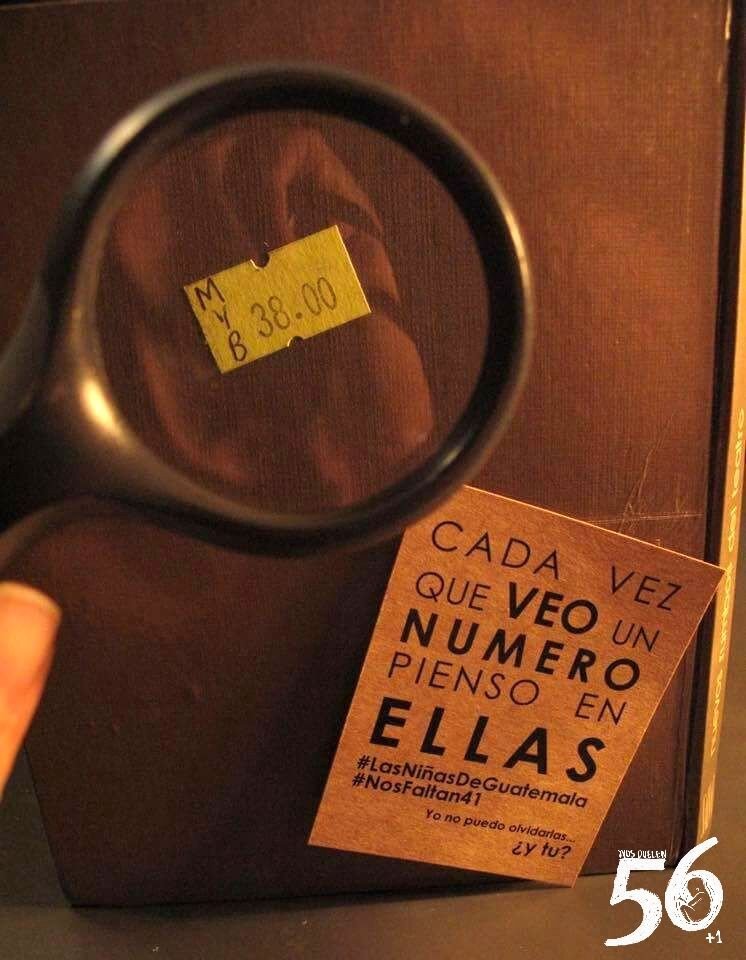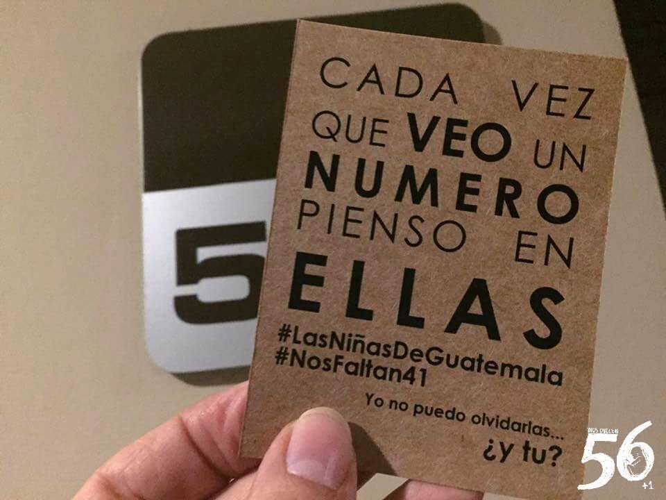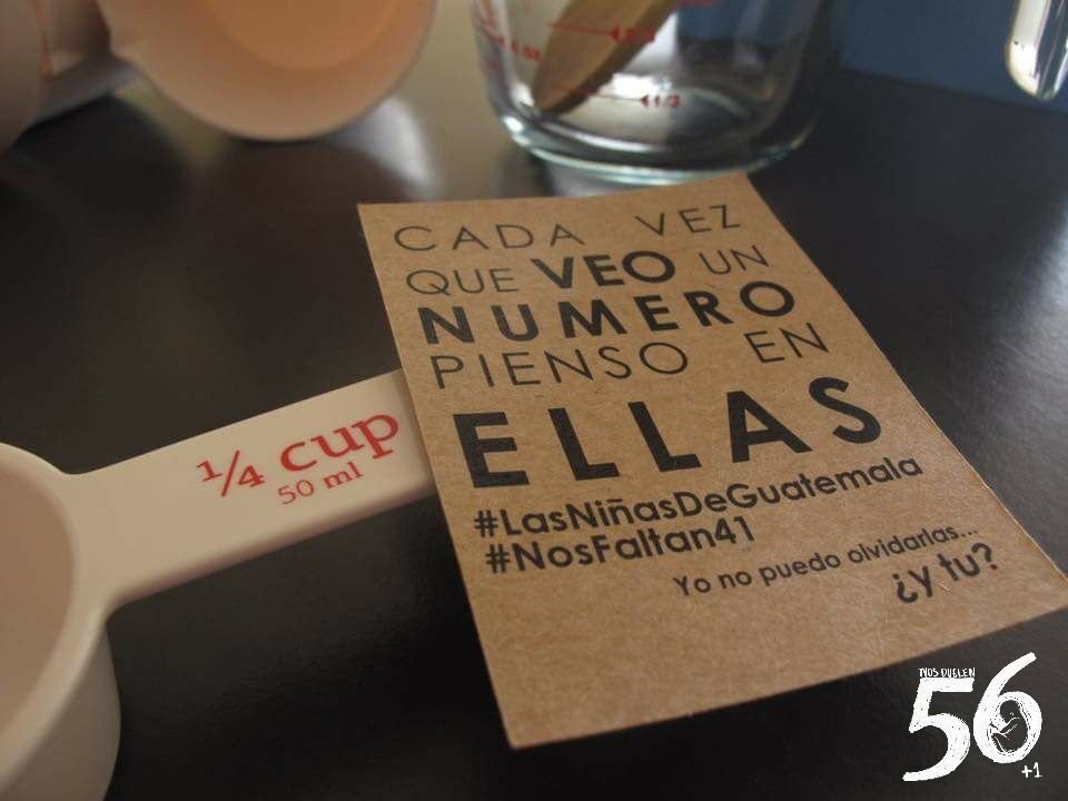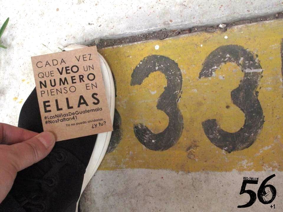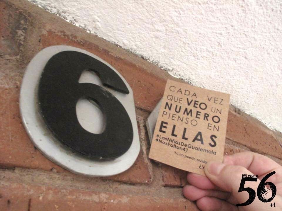 Parte de la campaña son las fotografías de la psicóloga guatemalteca, Andrea Bonilla, quien en su momento fue voluntaria en la morgue, durante la emergencia resultado de este crimen. En ellas Andrea utiliza números que aparecen en la cotidianidad y los relaciona con las 41 adolescentes que murieron calcinadas. Cada fotografía incluye un texto que dice “Cada vez que veo un número pienso en ellas”, y los hashtags #LasNiñasdeGuatemala #NosFaltan41.