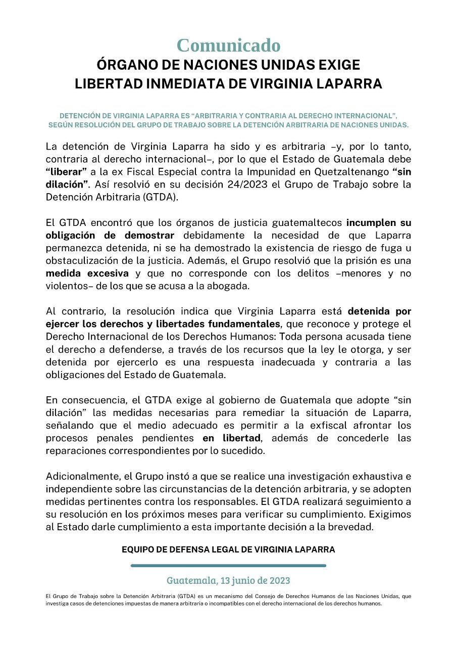 La detención de Virginia es contraria al Pacto Internacional de Derechos Civiles y Políticos en su artículo 914. Este es un tratado suscrito y ratificado por el Estado de Guatemala desde 1992, cuenta con un rango constitucional y por ello el grupo de trabajo exige al Estado de Guatemala que deje inmediatamente en libertad a Laparra.