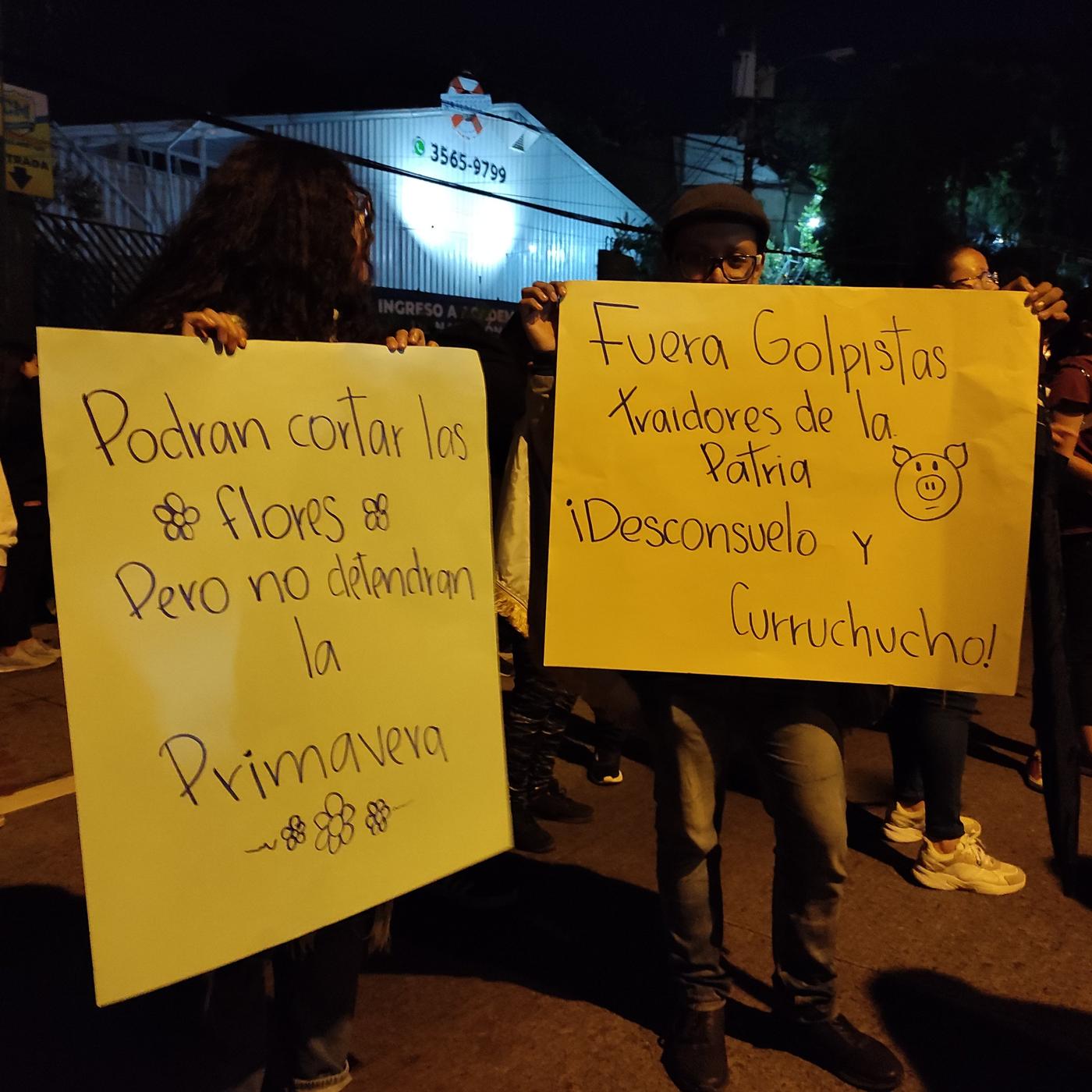 Algunas consignas visibles en carteles de los manifestantes mixqueños han sido: “ahora sí se metieron con todos”, “48 cantones estamos con ustedes” y “fuera golpistas traidores de la patria, Desconsuelo y Curruchucho”.