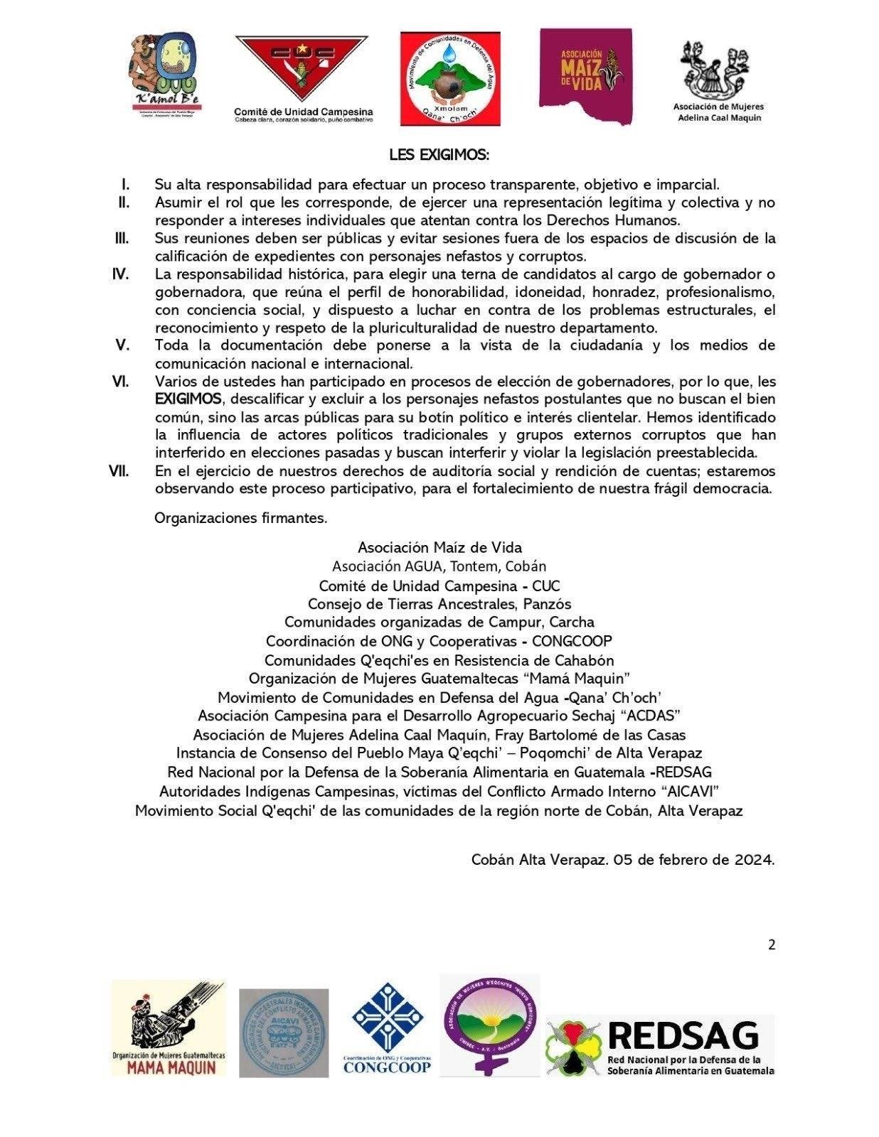 Organizaciones sociales de Alta Verapaz se pronunciaron, este lunes 5 de febrero, para comunicar que observarán el proceso de elección de la persona que concluirá con la designación de quien dirija la Gobernación Departamental.
