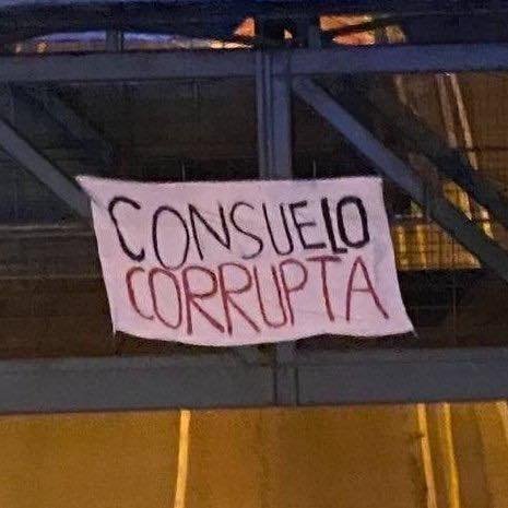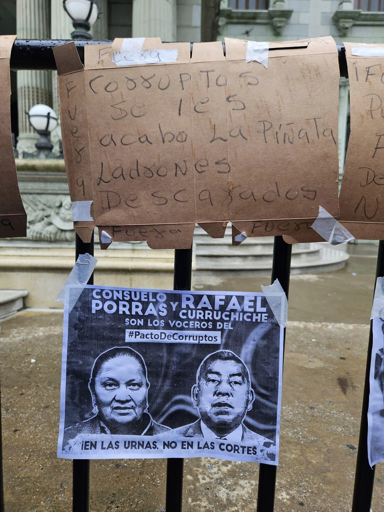 Este lunes, en diversos puntos de la ciudad capital se observaron mantas en las pasarelas con el mensaje: “No al golpe”, “No a la dictadura”, “Curruchiche traidor”y “Consuelo Corrupta”.