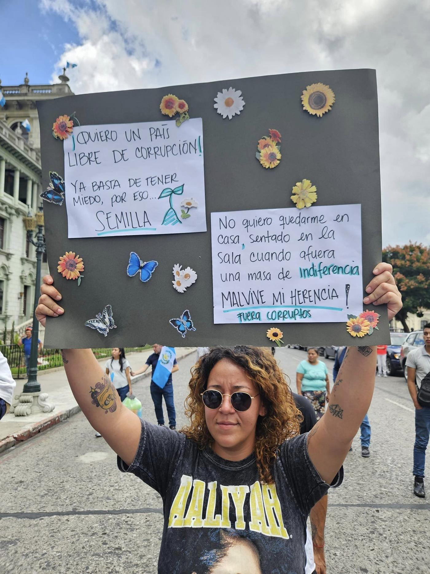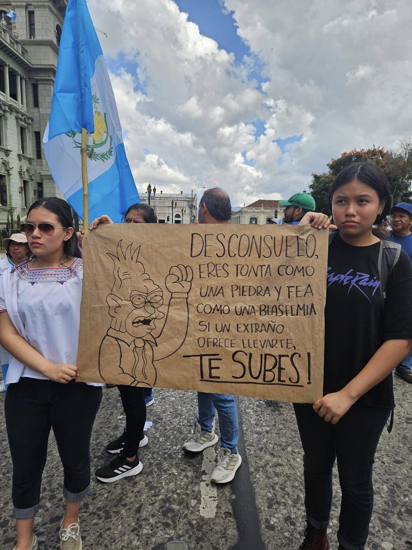 Además el colectivo del que formó parte Sara, también portó diversas consignas entre ellas un cartel con la fotografía de Consuelo Porras que decía: “La Fiera está herida, enemigo #1 de la Nación”, otros carteles decían: “Unidos por la democracia #RespetenMiVoto”, “El pueblo te necesita, no nos des la espalda, entre otros mensajes.
