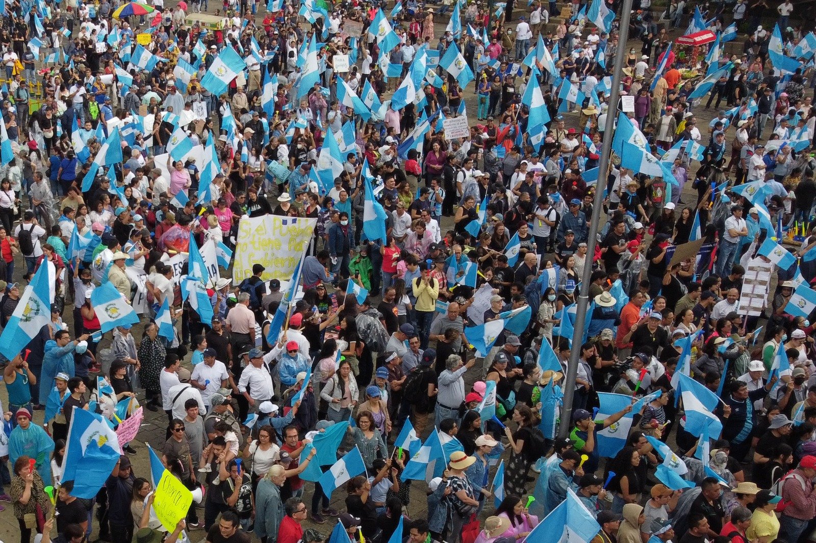 La Plaza, en el Centro Histórico capitalino, se fue llenando de familias con carteles, mantas, banderas de Guatemala, vuvuzelas y el reclamo ciudadano contra la incertidumbre en el proceso electoral, además del respaldo y al binomio presidencial electo.