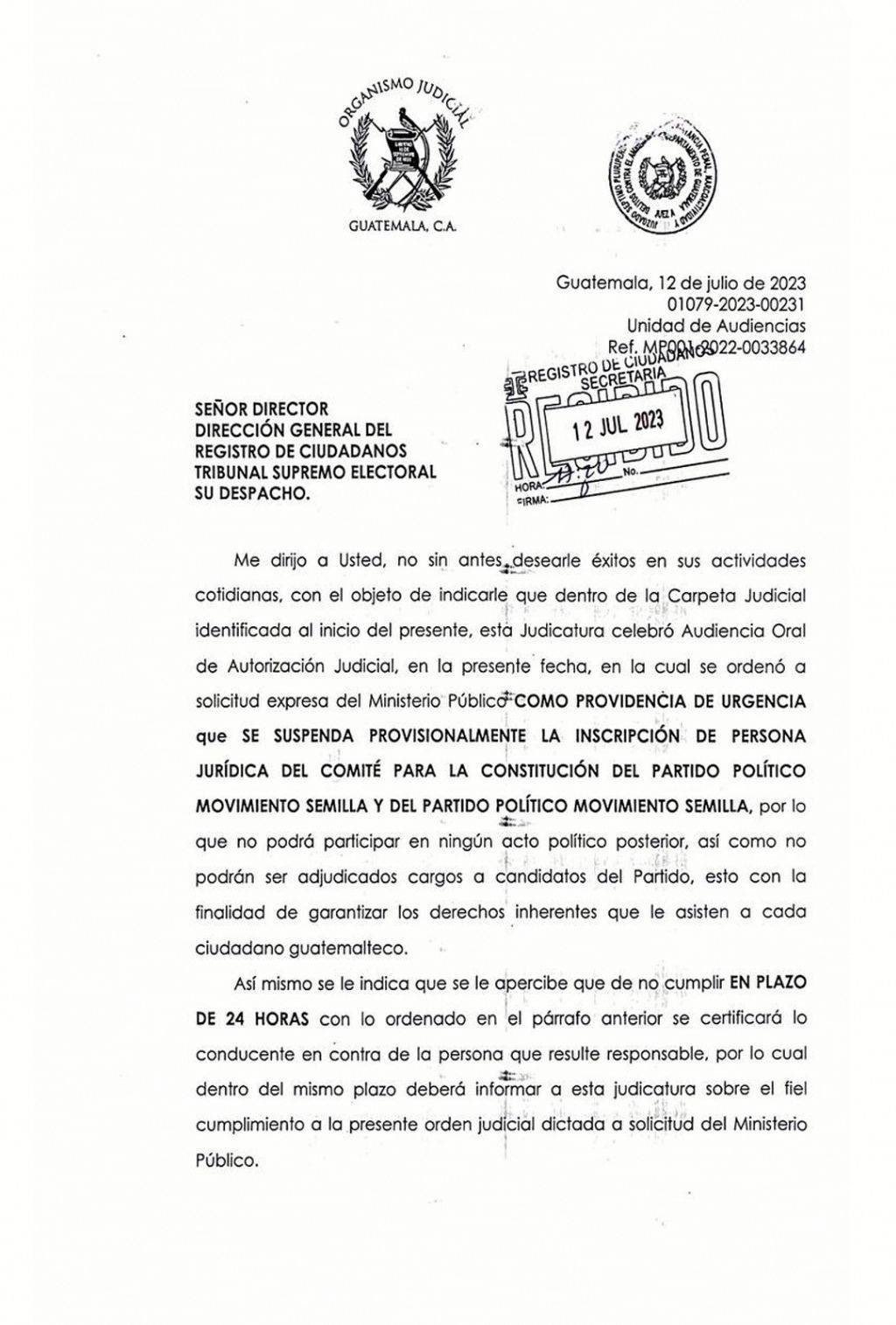 Horas antes de esa conferencia del TSE, el Movimiento Semilla y su binomio reiteraban que confiaban en que ese tribunal haría oficial los resultados y que nada impediría su llegada a la segunda vuelta. Se referían a lo señalado por Rafael Curruchiche, que ese mismo día enfatizó que existía una investigación contra Semilla a raíz de una denuncia de una firma falsa de adhesión al partido, por lo que Fredy Orellana del Juzgado Séptimo de Instancia Penal, habría girado una orden para suspender la personería jurídica del partido.
