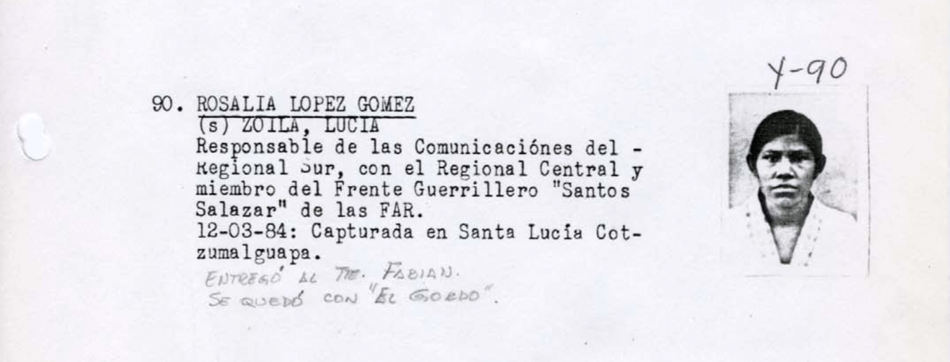 15. Rosalía López Gómez: Señalada de ser la responsable de las comunicaciones del Regional Sur con el Regional Central y miembro del Frente Guerrillero “Santos Salazar” de las FAR. Detenida el 12 de marzo de 1984 en Santa Lucía Cotzumalguapa.