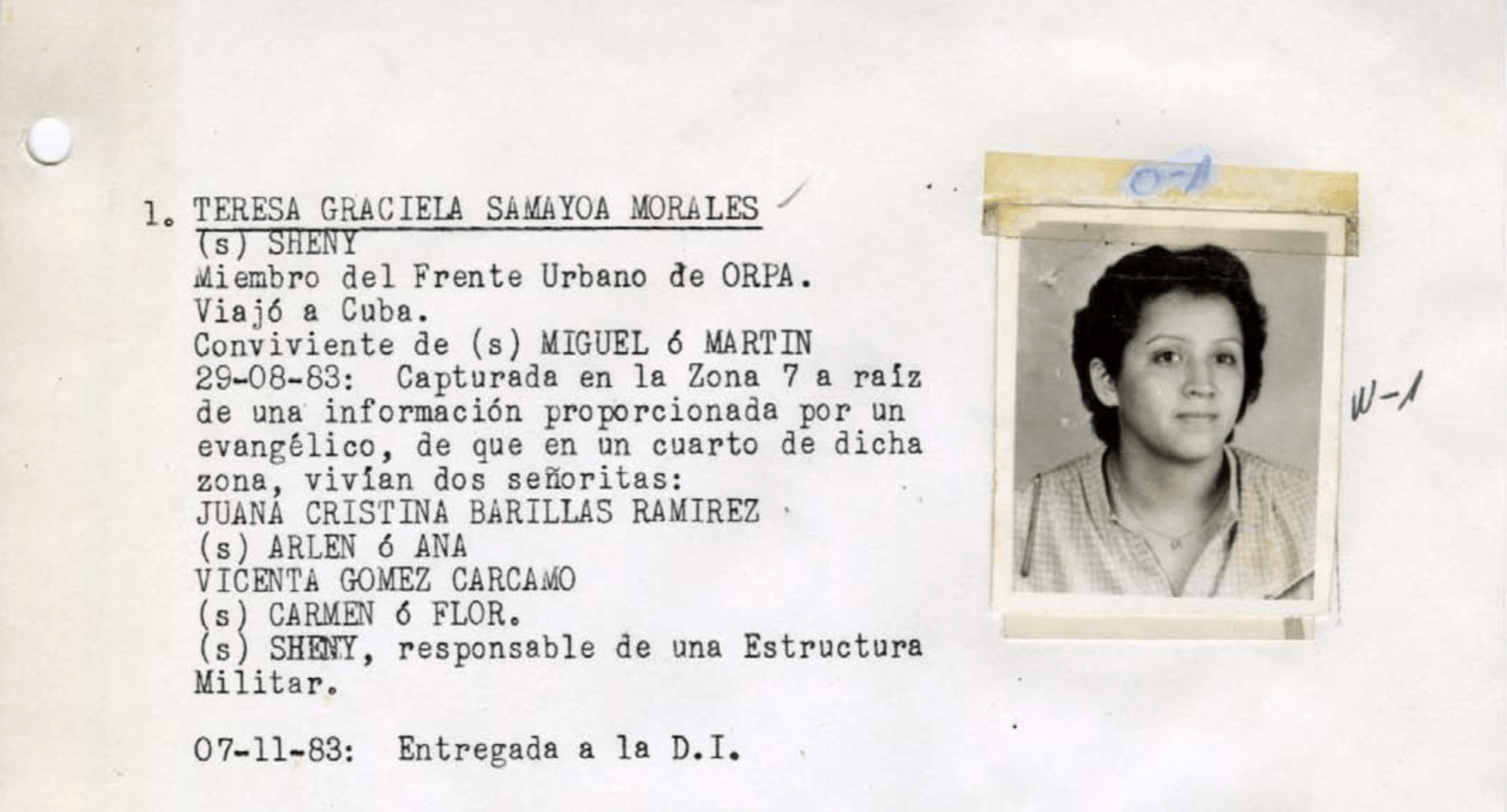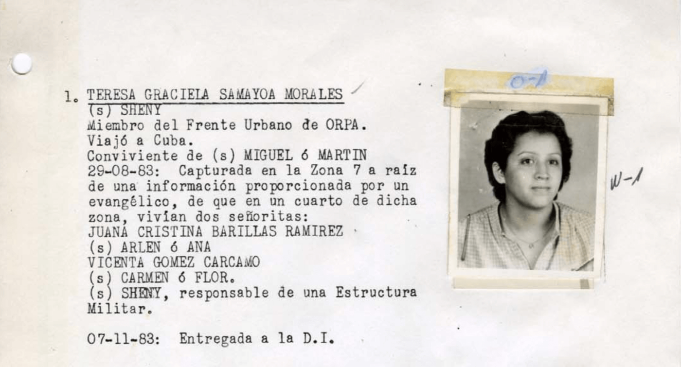 23. Teresa Graciela Samayoa Morales: Señalada de ser miembro del Frente Urbano de ORPA. Fue detenida en la zona 7 el 29 de agosto de 1983.