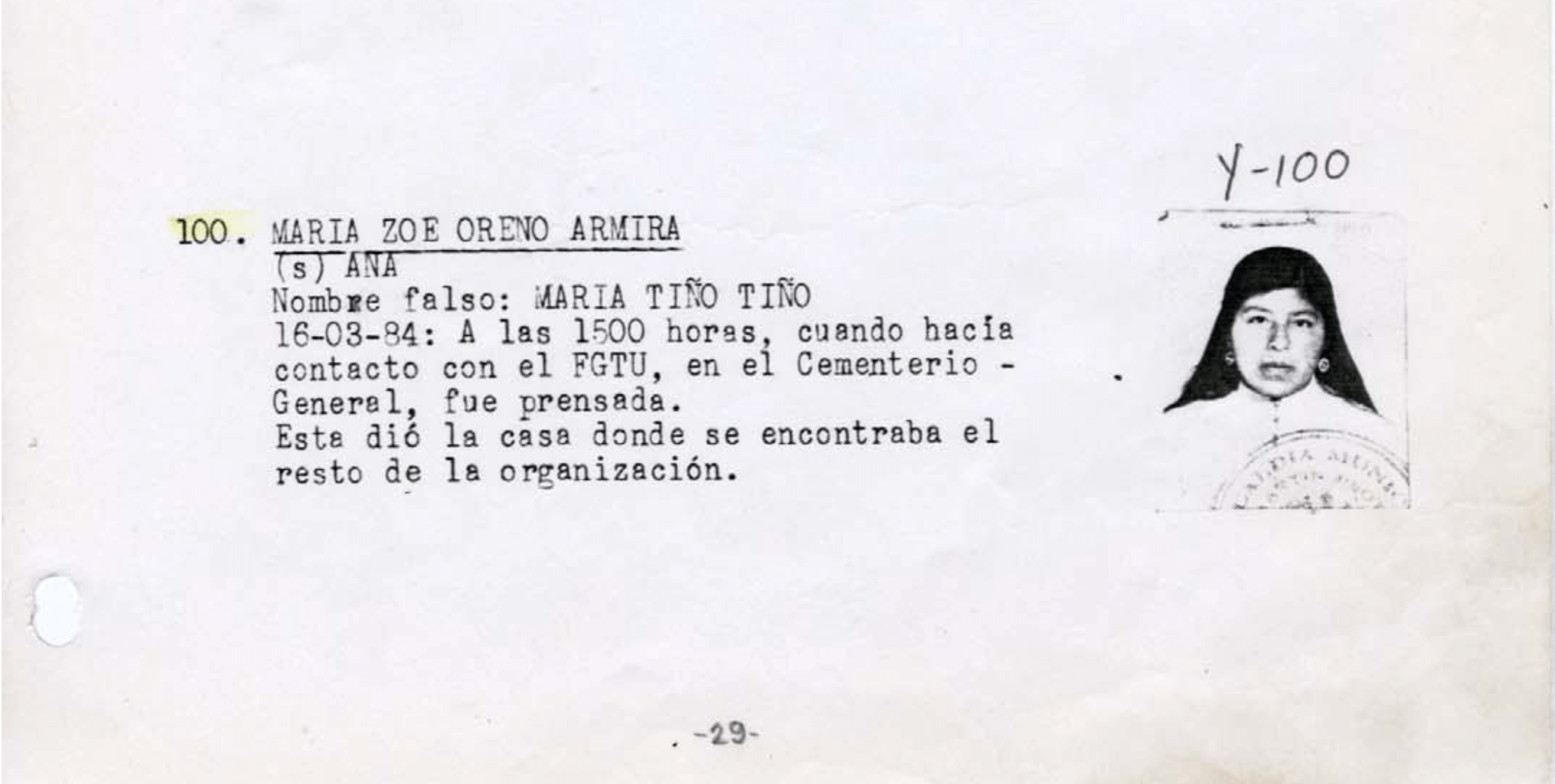 13. María Zoe (José) Oreno Armira: Detenida el 16 de marzo de 1984 en el Cementerio General. Señalada de haber contactado con el FGTU y habría dado hospedaje al resto de la organización.
