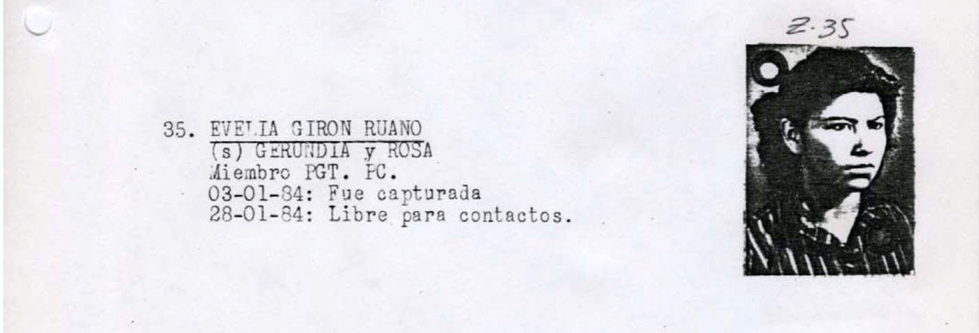 20. Evelia Girón Ruano: Señalada de ser miembro del PGT. Fue detenida el 3 de marzo de 1984 y liberada 25 días después para crear contactos.