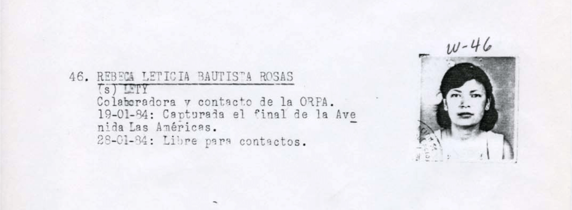 18. Rebeca Leticia Bautista Rosas: Señalada de ser colaboradora y contacto de la ORPA. Fue detenida el 19 de enero de 1984 y posteriormente, liberada para crear contactos.