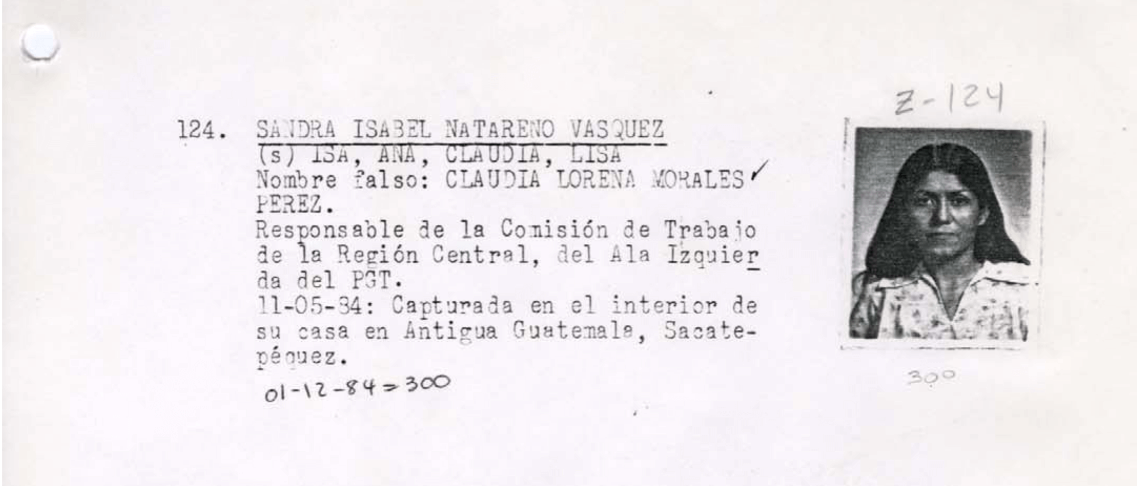 8. Sandra Isabel Natareno Vásquez: Responsable de la Comisión de Trabajo de la Región Central del Ala Izquierda del PGT. Fue detenida el 11 de mayo de 1984 en Antigua Guatemala.