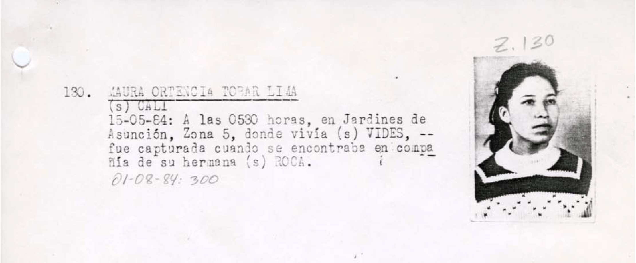 6. Maura Ortencia Tobar Lima: Detenida el 15 de mayo de 1984 en Jardines de la Asunción, zona 5 de la capital, junto a su hermana María Magdalena.