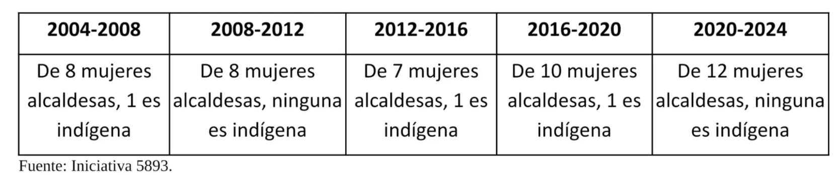 Pero en las alcaldías, la disparidad es amplia tanto en género como en etnia. Según datos de la iniciativa 5893, una propuesta de Gutiérrez Raguay, en los últimos 20 años ha habido 45 alcaldesas y solo 3 de ellas han sido indígenas.