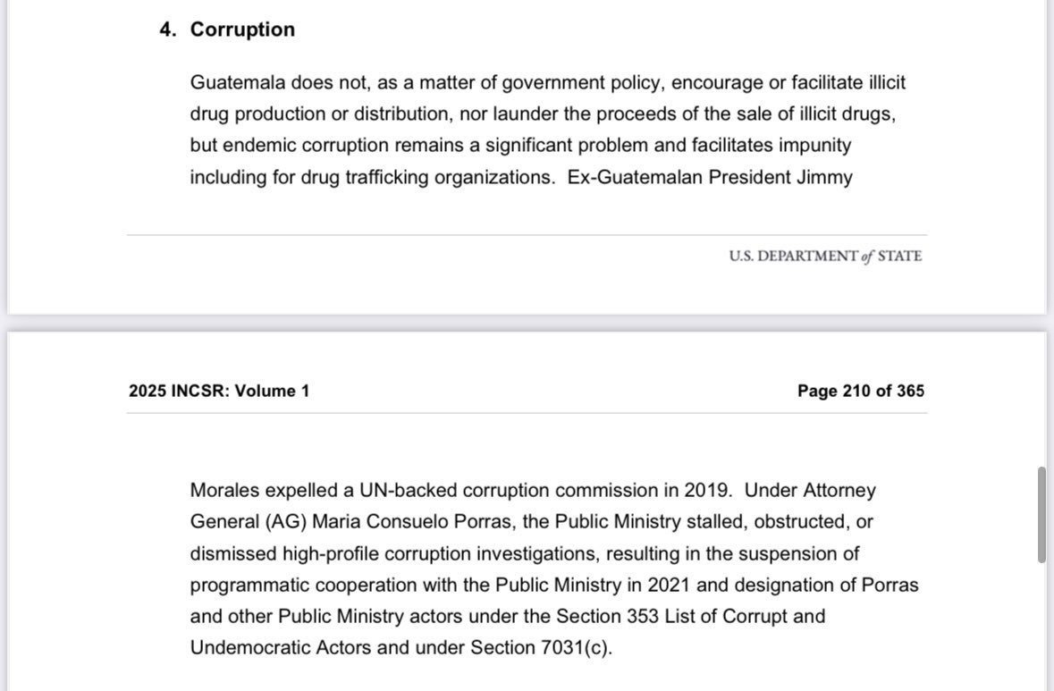 “El expresidente guatemalteco Jimmy Morales expulsó en 2019 a una comisión contra la corrupción respaldada por la ONU. Bajo el mandato de la fiscal general María Consuelo Porras, el Ministerio Público estancó, obstruyó o desestimó investigaciones de alto perfil sobre corrupción, lo que llevó a la suspensión de la cooperación programática con dicha institución en 2021 y a la inclusión de Porras y otros funcionarios del Ministerio Público en la Lista 353 de Actores Corruptos y Antidemocráticos, así como en la Sección 7031(c)”, indica el informe.