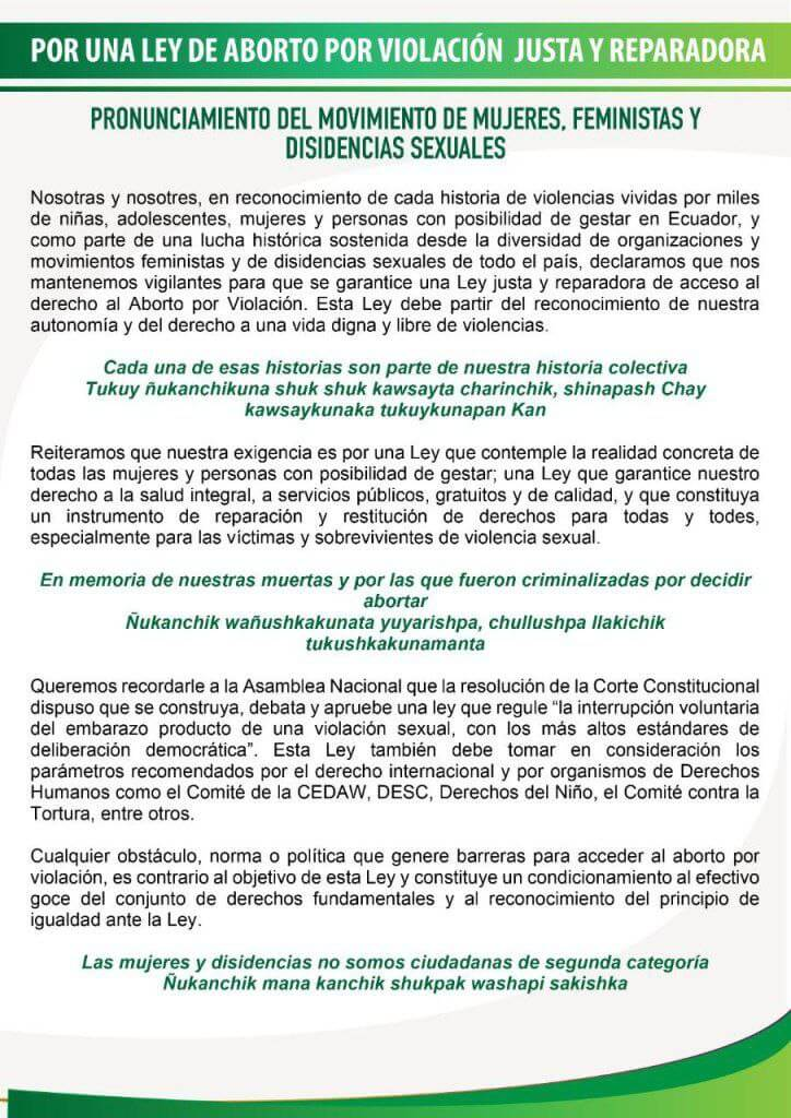 En los exteriores de la Asamblea un centenar de mujeres, feministas y personas de las disidencias sexuales se concentraron para exigir a la Asamblea la aprobación de la Ley sin retrocesos. Al final de la la acción, realizaron el “Pañuelazo”, una acción activista que consiste en extender sus pañuelos verdes, como símbolo de la lucha por el aborto legal en la región. Además anunciaron que realizarán una Movilización Nacional Feminista por el Aborto Por Violación en a finales de enero Quito cuando el debate llegue nuevamente al pleno.