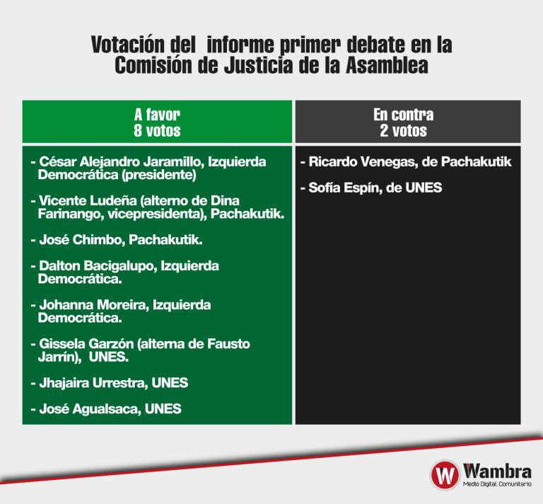 La Comisión de Justicia y Estructura del Estado realizó 16 sesiones, con 47 comparecencias, para, finalmente, el 3 de diciembre aprobar el informe para primer debate con ocho votos a favor y dos en contra. Los votos en contra fueron de la asambleísta Sofía Espín, de Unió Por la Esperanza, UNES, y del asambleísta Ricardo Venegas, de Pachakutik. Dos asambleístas de partidos políticos pertenecientes a la tendencia de izquierda, pero que en cuanto a los derechos sexuales y reproductivos han posicionado discursos ultra conservadores.