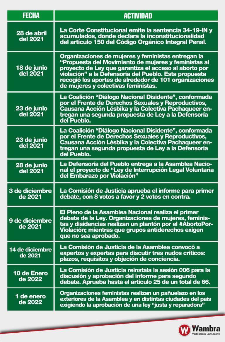 Con estos insumos, la Defensoría del Pueblo, con Zaida Rovira como defensora encargada, entregó a la Asamblea Nacional, el 28 de junio de 202, el proyecto de Ley para Garantizar el Derecho a la Interrupción del Embarazo por Violación. A partir de ahí, el reloj empezó a correr para la Asamblea que, según el dictamen de la Corte, contaba con seis meses para su aprobación.