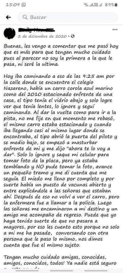El 2 de diciembre de 2020, una joven hizo una publicación en la red social Facebook en la que relató que iba caminando en una calle “donde se encuentra el colegio Nazareno”, a eso de las 9:25 de la mañana, donde había un carro Corolla azul marino, “como del 2010”, estacionado enfrente de una casa.
