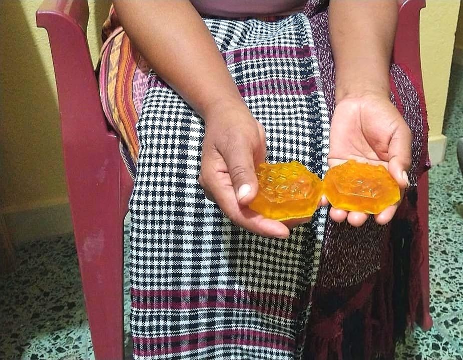 Junto a su familia —su padre, hermana y sobrina—, decidió invertir en la producción de jabones con miel. Para ello, adquieren los materiales necesarios en el mercado local de su comunidad. Brígida nos guía a través del proceso de fabricación de estos jabones, mostrándonos cuidadosamente cada paso en una pequeña maqueta.