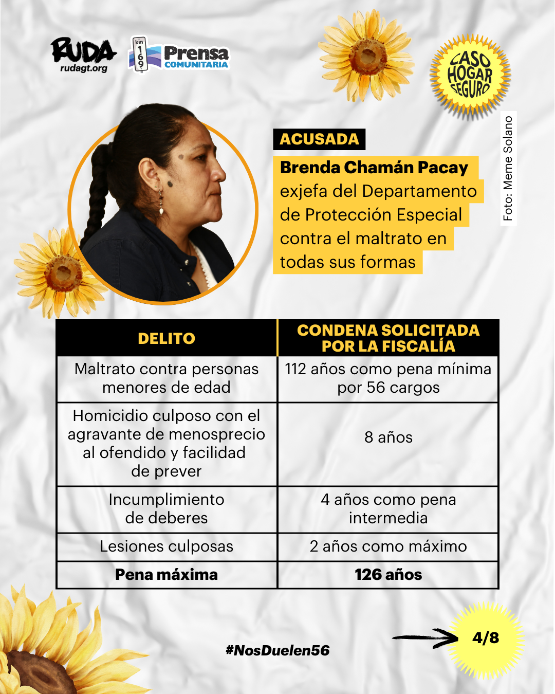 Finalmente, a este grupo fue integrada Crucy Flor de María López, quien siendo monitora de un centro de detención para menores de edad, se encontraba en las afueras del Hogar Virgen de la Asunción la noche del 7 de marzo y, abusando de sus poderes, roció con gas pimienta a las y los adolescentes. Por estos delitos, los cuatro enfrentan un caso penal.