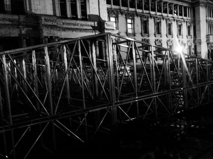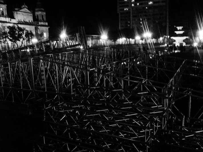 A las 6 de la tarde, la gente que no ha parado de asistir al parque central se topó con la sorpresa, varios trabajadores comenzaron a armar varias estructuras de metal, sobre la calle colocaron equipo pesado, plantas de energía como para iluminar un estadio de futbol, tarimas, cajas metálicas, etc.