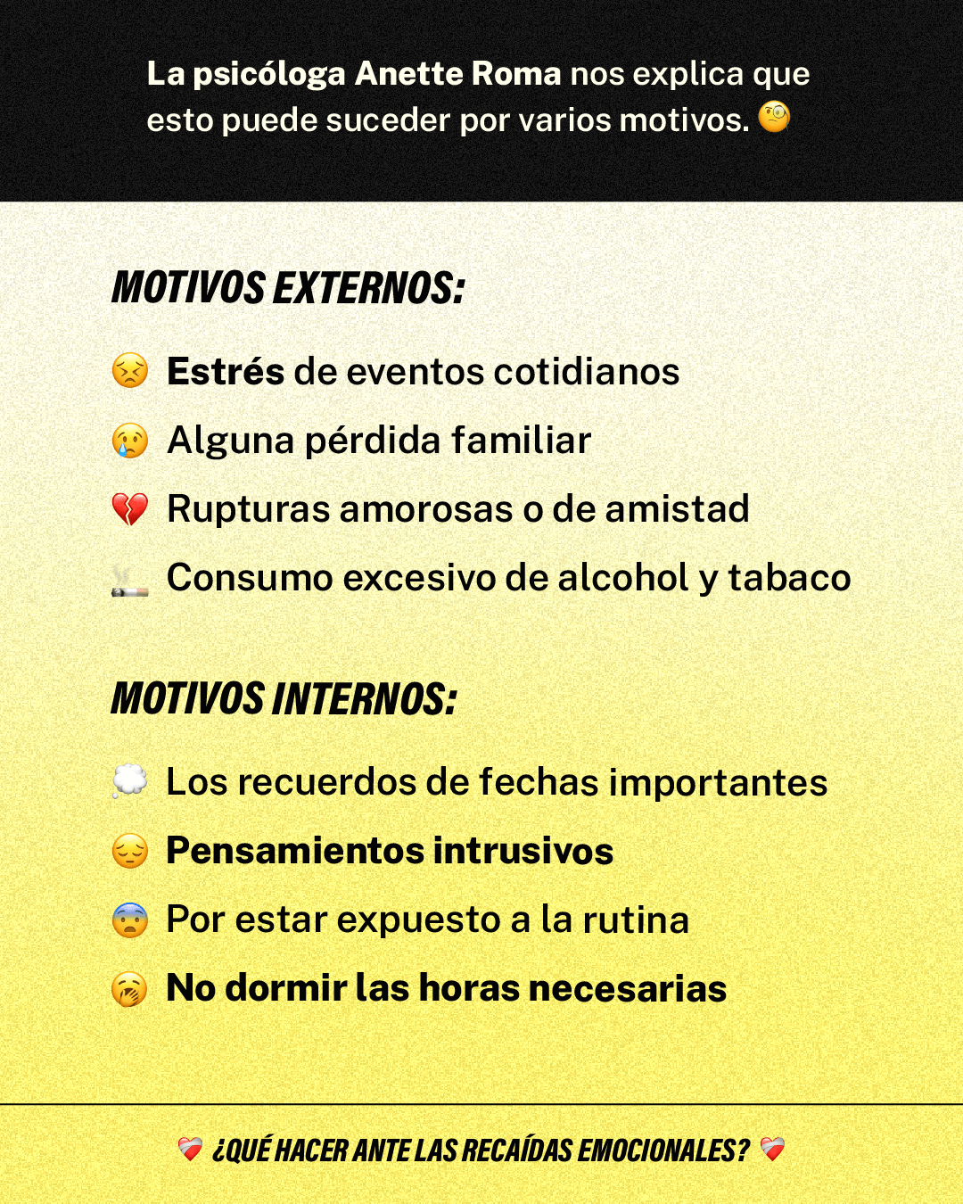 Cuerpo y Territorio ¿Qué hacer ante las recaídas emocionales? 13 Febrero 2023 Escrito por Angie Ross Salud mental Compartir Twitter Facebook Whatsapp Telegram Correo Participaron de esta nota Angie Ross 134 artículos