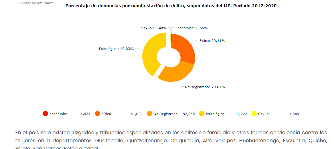 En el país solo existen juzgados y tribunales especializados en los delitos de femicidio y otras formas de violencia contra las mujeres en 11 departamentos: Guatemala, Quetzaltenango, Chiquimula, Alta Verapaz, Huehuetenango, Escuintla, Quiché, Sololá, San Marcos, Petén e Izabal.