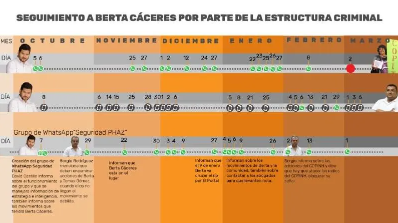 Como ya se había mencionado en el primer juicio de la causa, las comunicaciones entre Castillo y Bustillo, que coordinaba el sicariato, prueban que hubo al menos un intento de asesinato antes de consumar el femicidio la noche del 2 de marzo de 2016 en la residencia de Berta ubicada en La Esperanza, Intibucá. El 2 de febrero de 2016 las comunicaciones prueban que Díaz estaba vigilando y fotografiando a Berta y le iba comunicando a Bustillo los movimientos de la líder lenca. El 5 de febrero, Castillo habló con Bustillo sobre una “misión” y le pidió que cuide “los accidentes de la escena”, pero el día 6 Bustillo le informó que la misión había sido “abortada”: “Ayer no se pudo. Esperaré lo que usted diga porque ya no tengo logística”. Castillo le respondió: “Yo no necesito la información, necesito lo que usted va a presupuestar para el trabajo”.