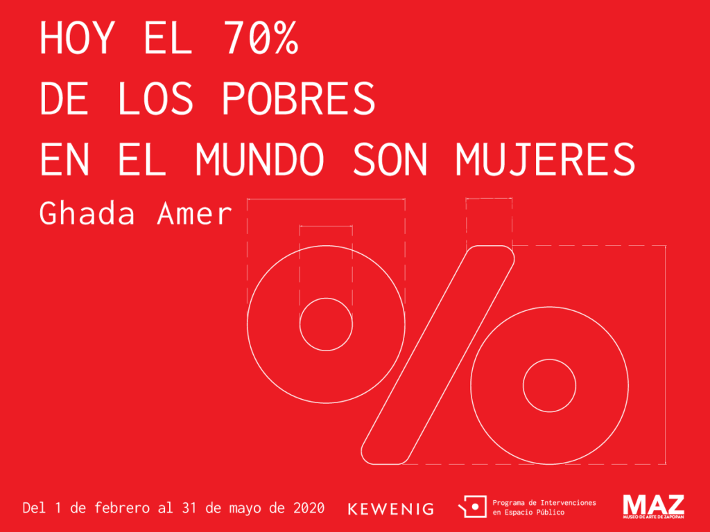 Ghada Amer ofrece una evidencia material, por medio de la frase construida en letras gigantes de resina roja “El 70 % de los pobres en el mundo son mujeres”, de que las mujeres son el grupo más marginado, incluso en países desarrollados. Al introducir su trabajo al contexto urbano, de manera literal y simbólica, la artista reclama su derecho, el de todas las mujeres, de ocupar el espacio público en toda su dimensión política.