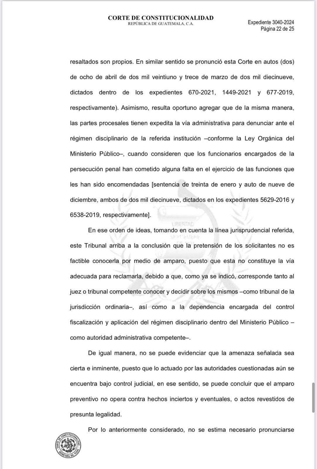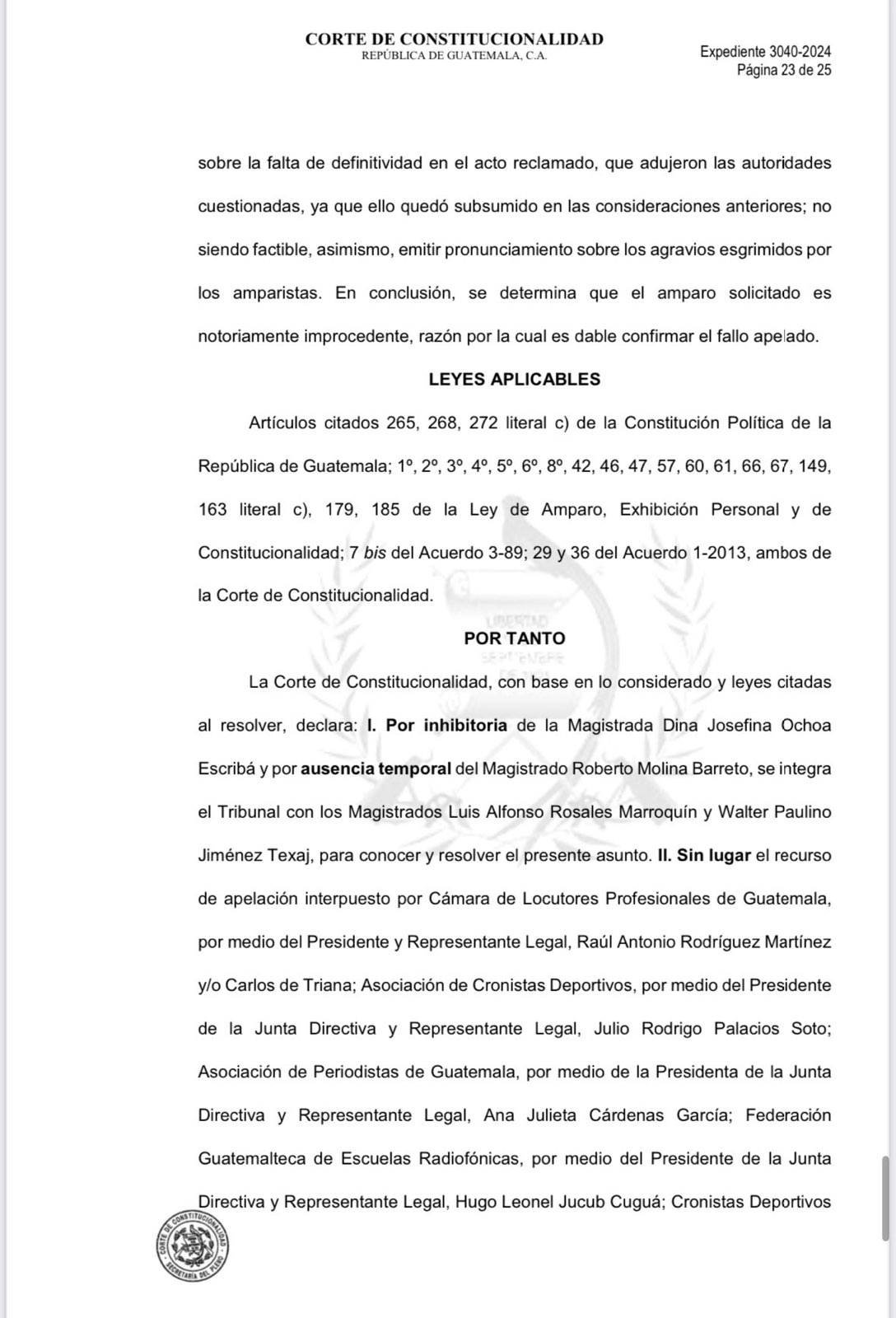 El recurso legal fue solicitado por la Cámara de Locutores Profesionales de Guatemala, la Asociación Cronistas Deportivos, Asociación de Periodistas de Guatemala, Federación Guatemalteca de Escuelas Radiofónicas (FGER), el gremio de periodistas de Guatemala e integrantes del colectivo Red Rompe el Miedo Guatemala, contra el fiscal Rafael Curruchiche y la fiscal regional del metropolitana, Silvia Janeth García Guzmán.